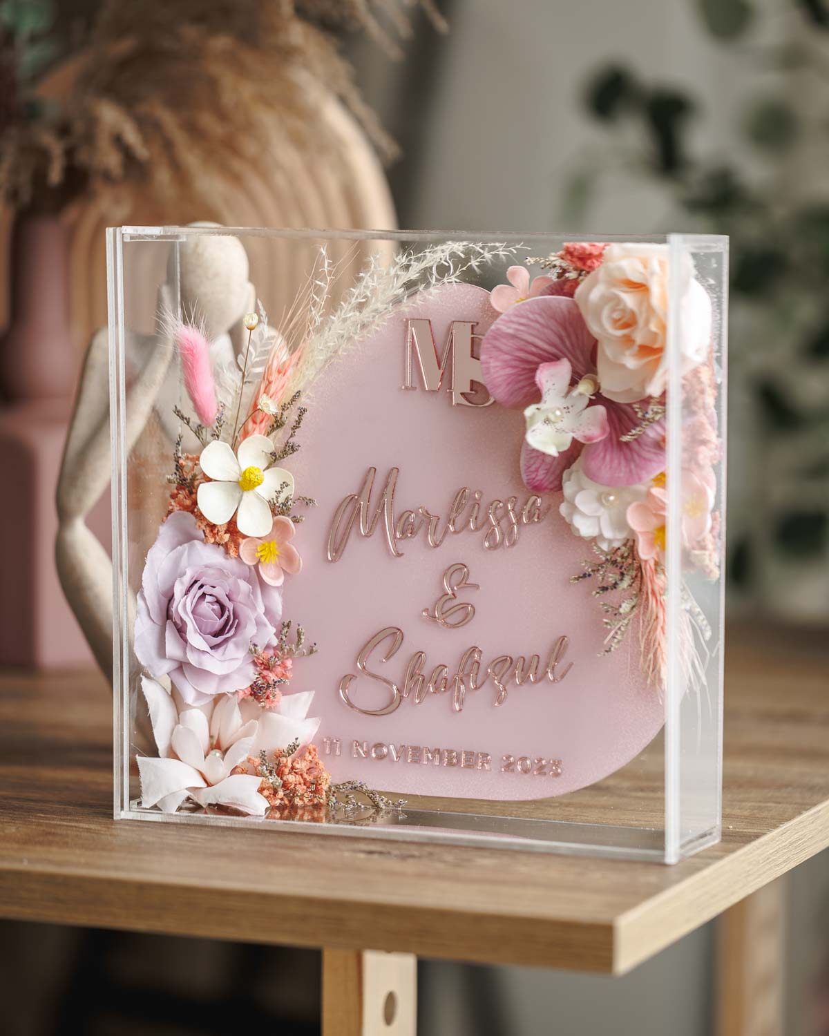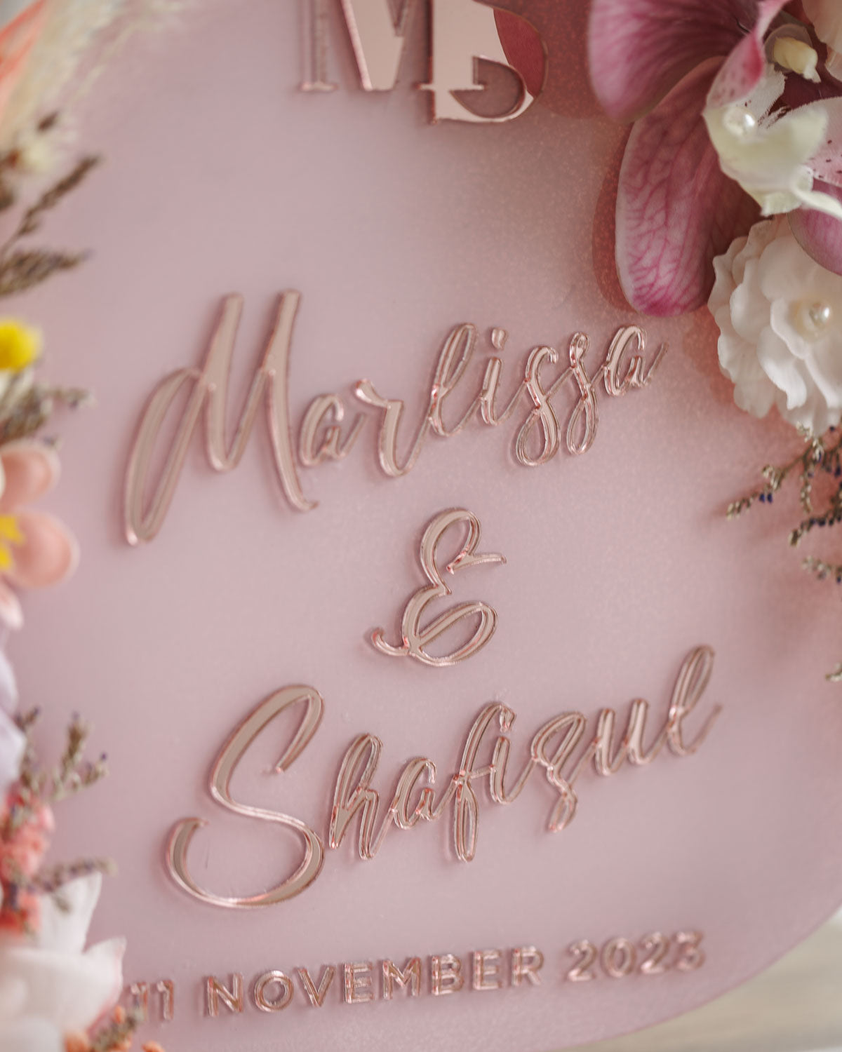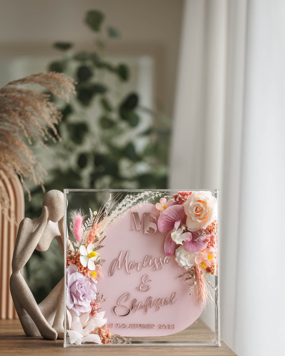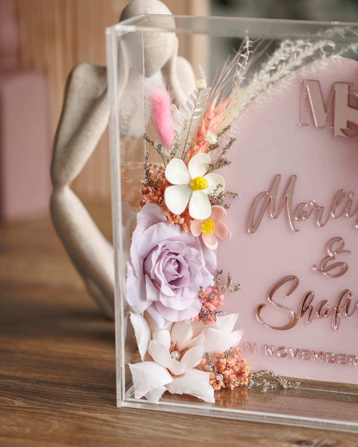 Discover the perfect wedding gift in our enchanting glass acrylic frame, adorned with a delightful array of pink and pastel tones and intricate floral details. Featuring a delicate floral arrangement surrounding the names of the couple, this charming gift exudes elegance and sentimentality. Bring joy to the newlyweds with a timeless keepsake that captures the beauty of their love. Order now and make their special day even more memorable!