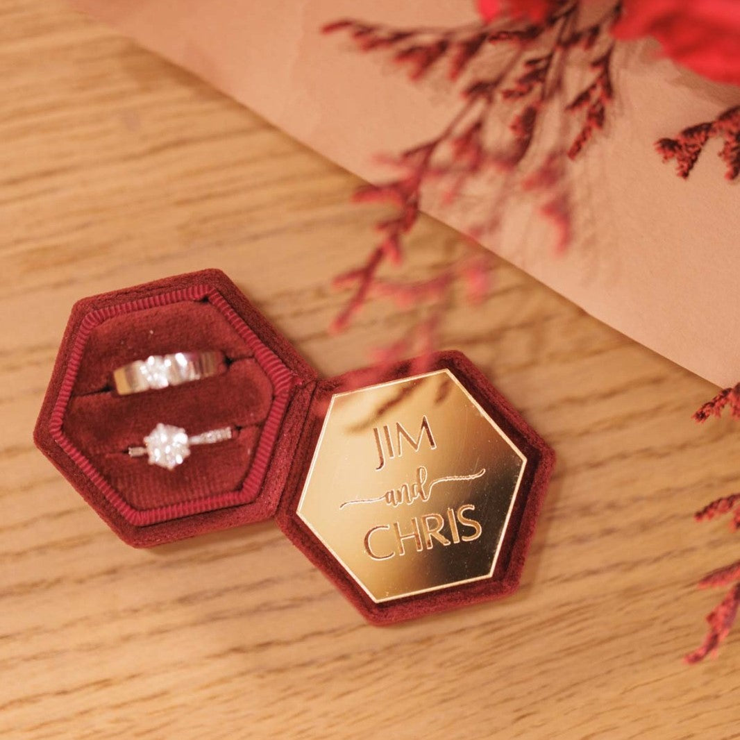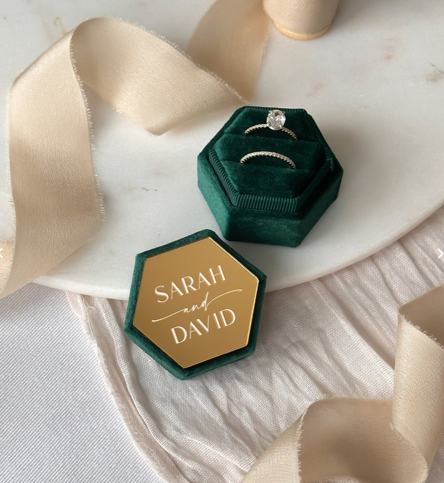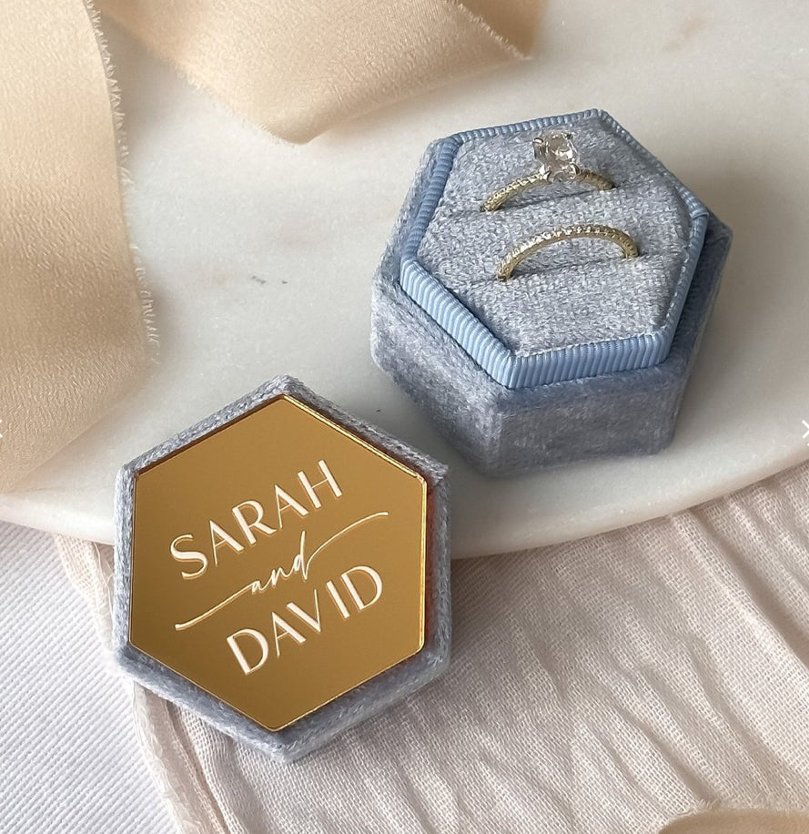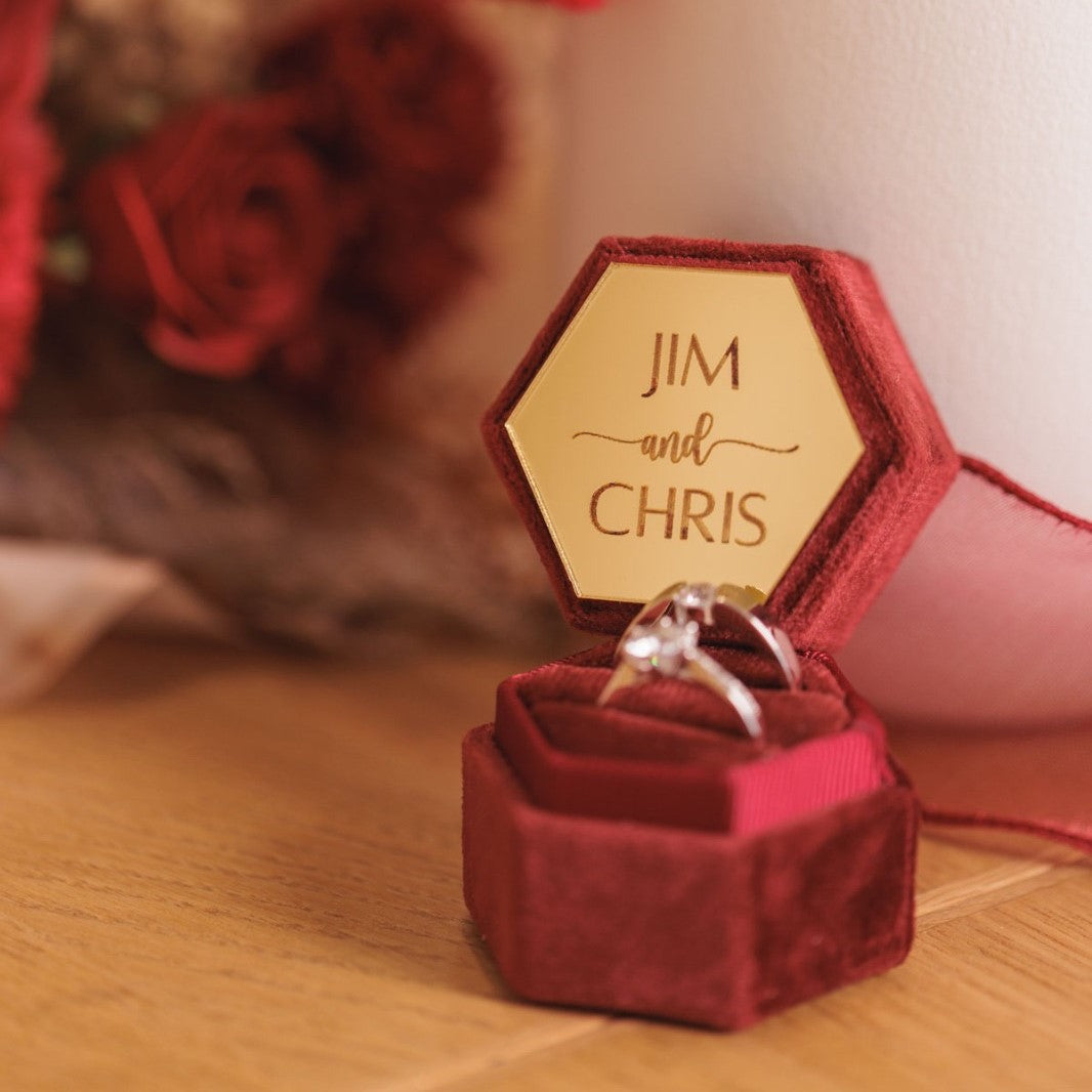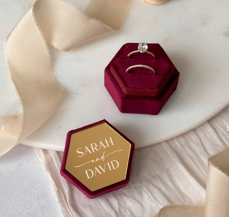This elegant ring box is designed specifically for wedding rings and features a personalized name engraving. Made with high-quality materials, it adds a special touch to your special day. Keep your ring safe and secure while showcasing its unique design. Add a personal touch to your wedding with this beautifully crafted ring box.