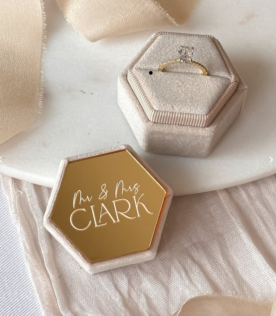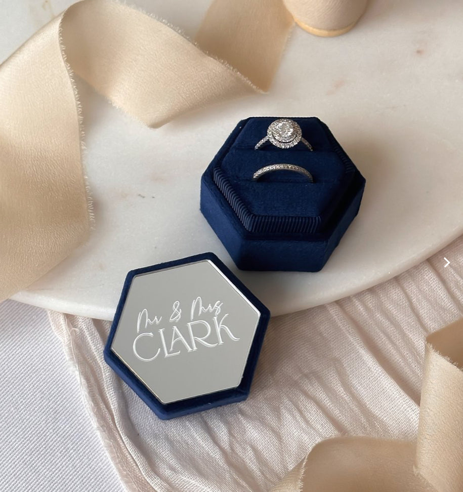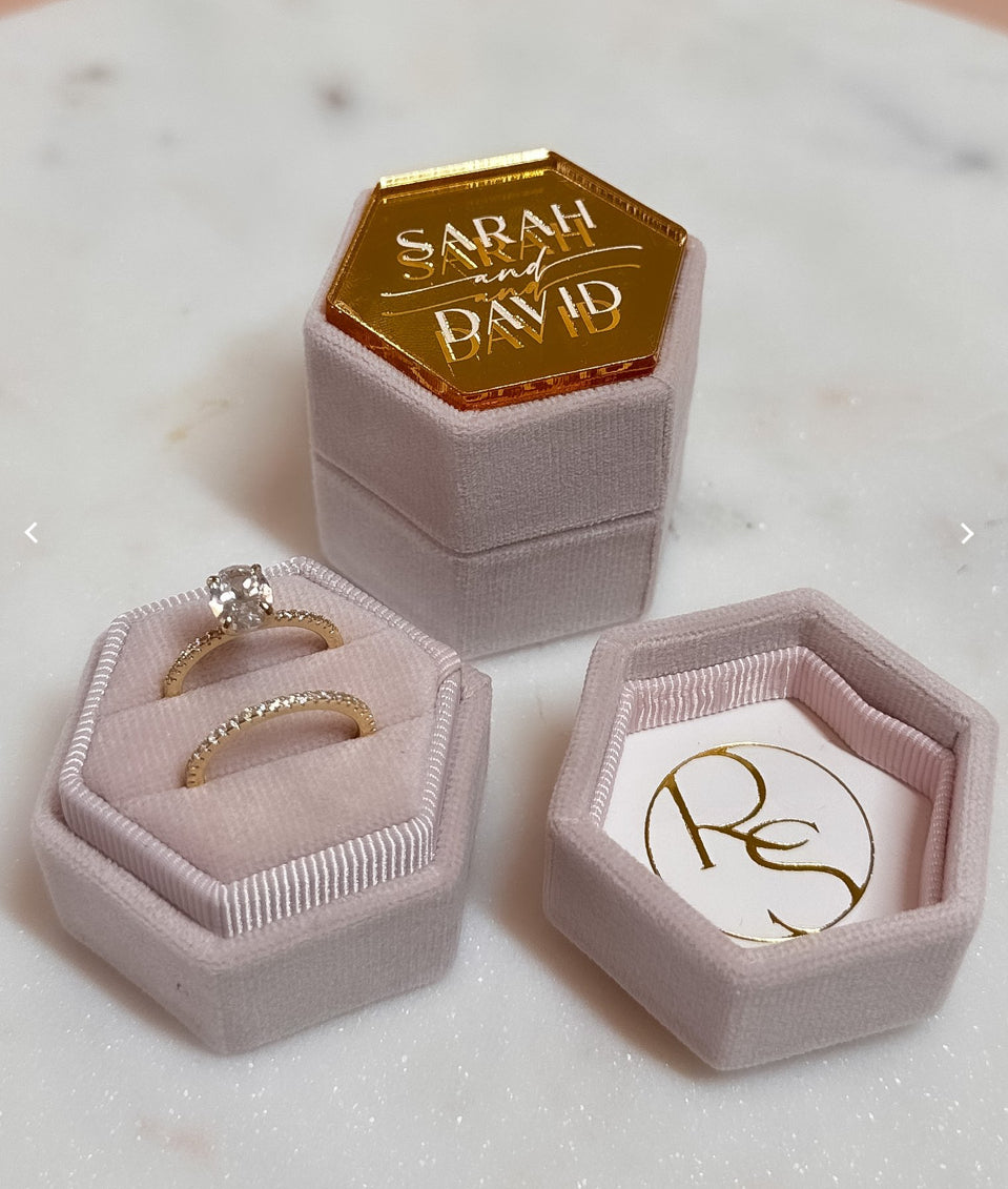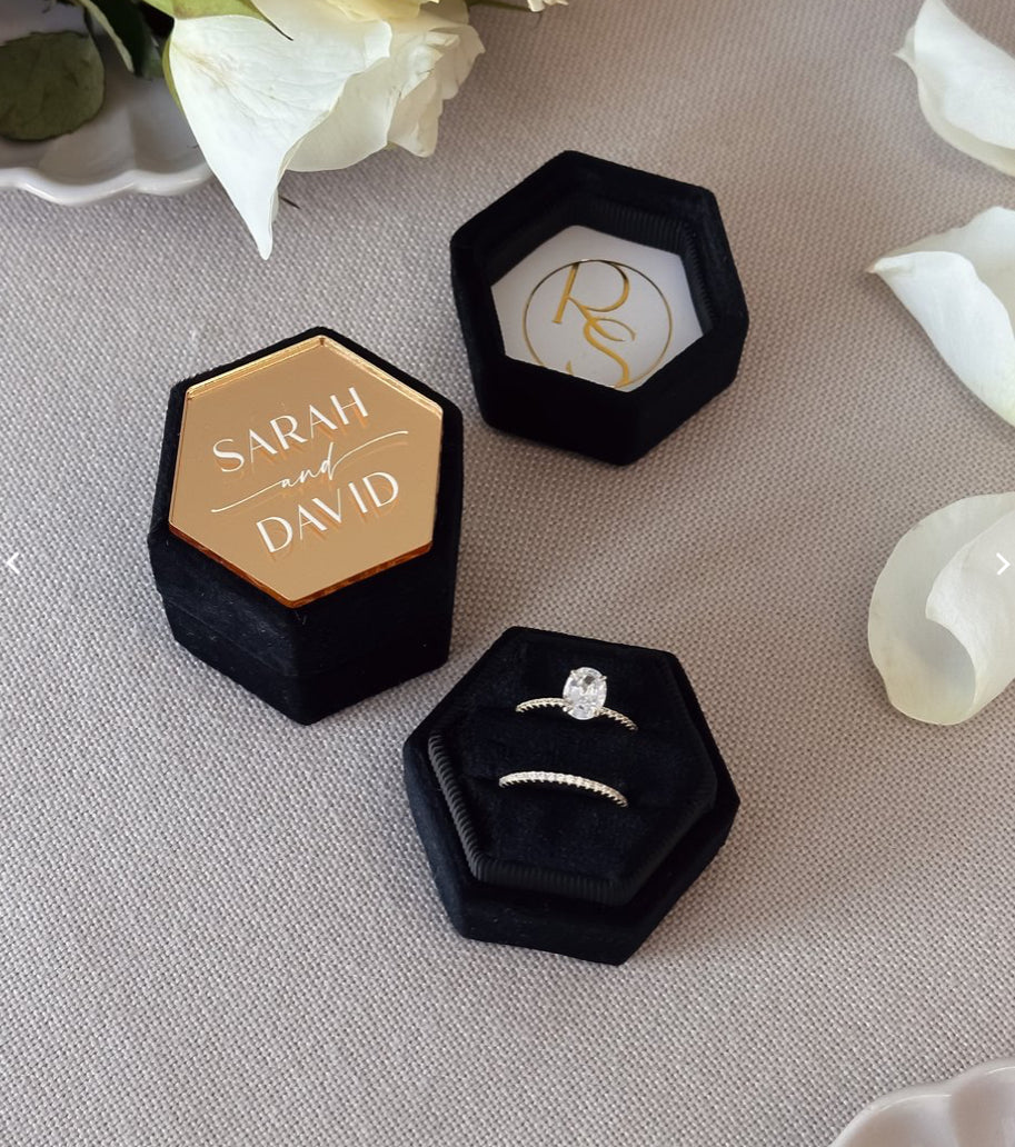 This elegant ring box is designed specifically for wedding rings and features a personalized name engraving. Made with high-quality materials, it adds a special touch to your special day. Keep your ring safe and secure while showcasing its unique design. Add a personal touch to your wedding with this beautifully crafted ring box.