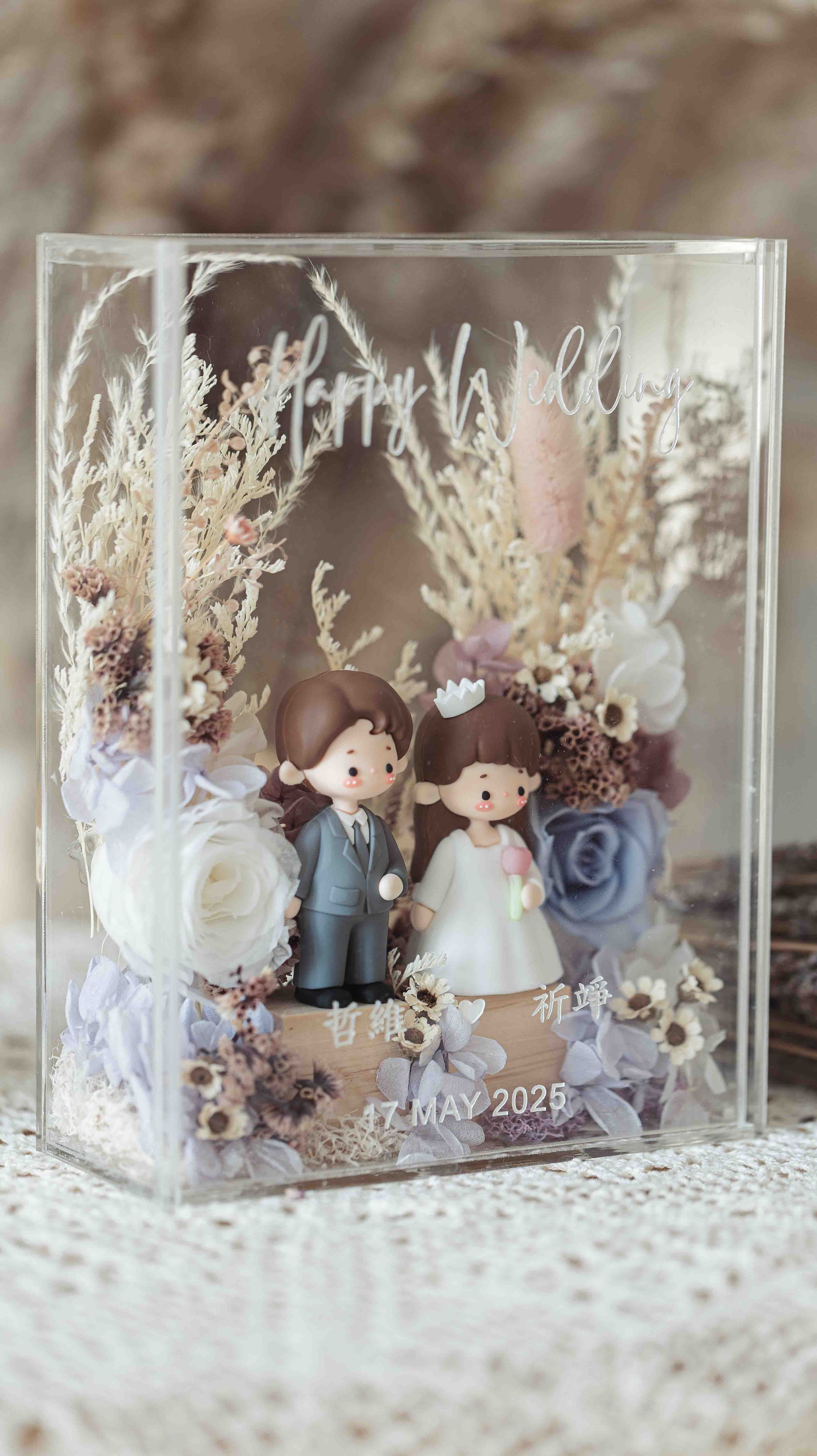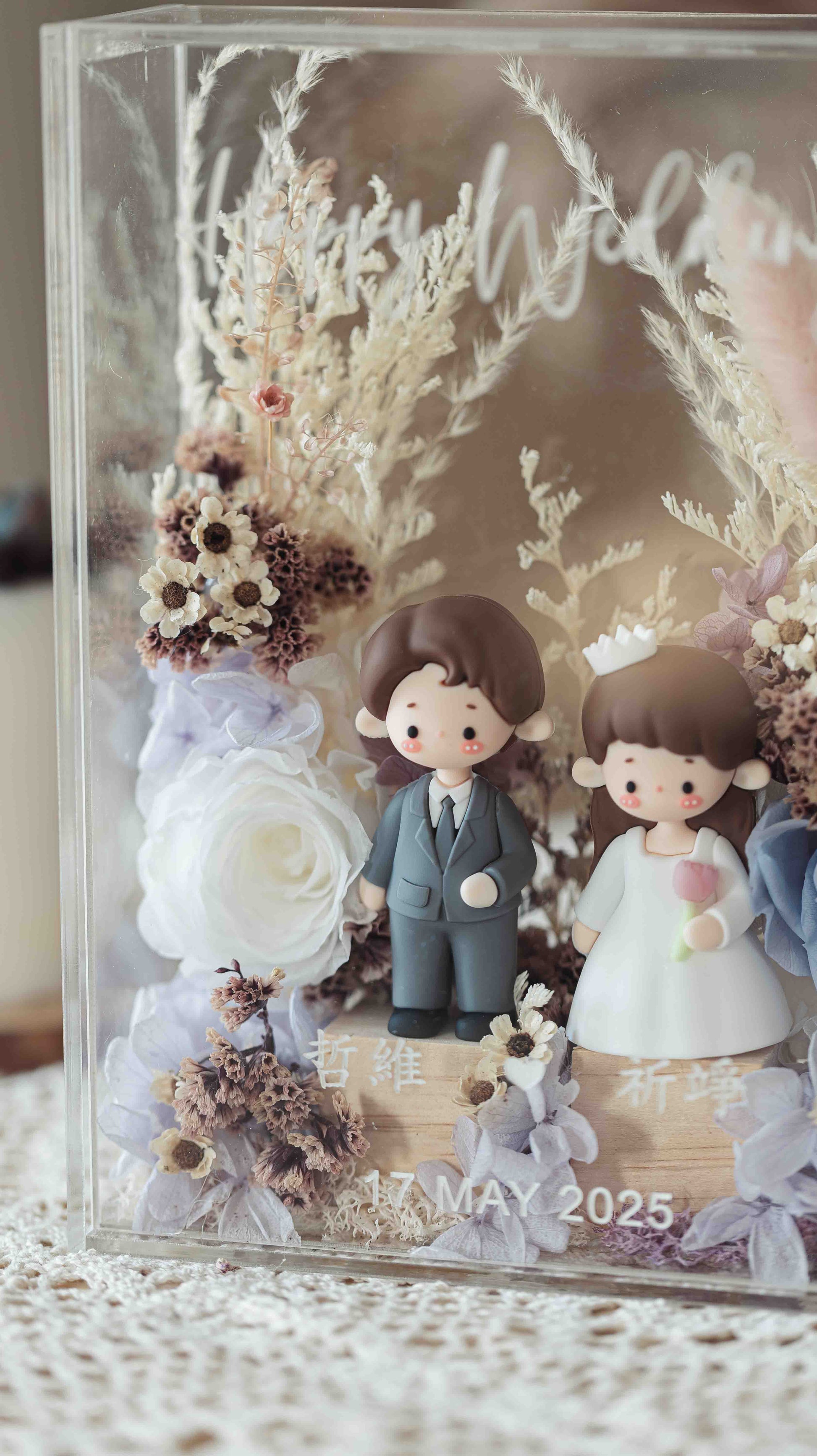 This charming wedding couple doll set is beautifully encased in an acrylic box, making it a perfect keepsake for newlyweds. The handcrafted figurines of the bride and groom are dressed in elegant attire, capturing the essence of love and celebration. Surrounding them is an exquisite floral arrangement in soft pastel tones, featuring delicate roses, hydrangeas, and dried botanicals that add a touch of natural beauty and romance. The personalized engraving at the front adds a sentimental touch, making this piece not only a wedding gift but a lasting symbol of the couple’s love story. This sophisticated display is a timeless reminder of a couple’s special day.