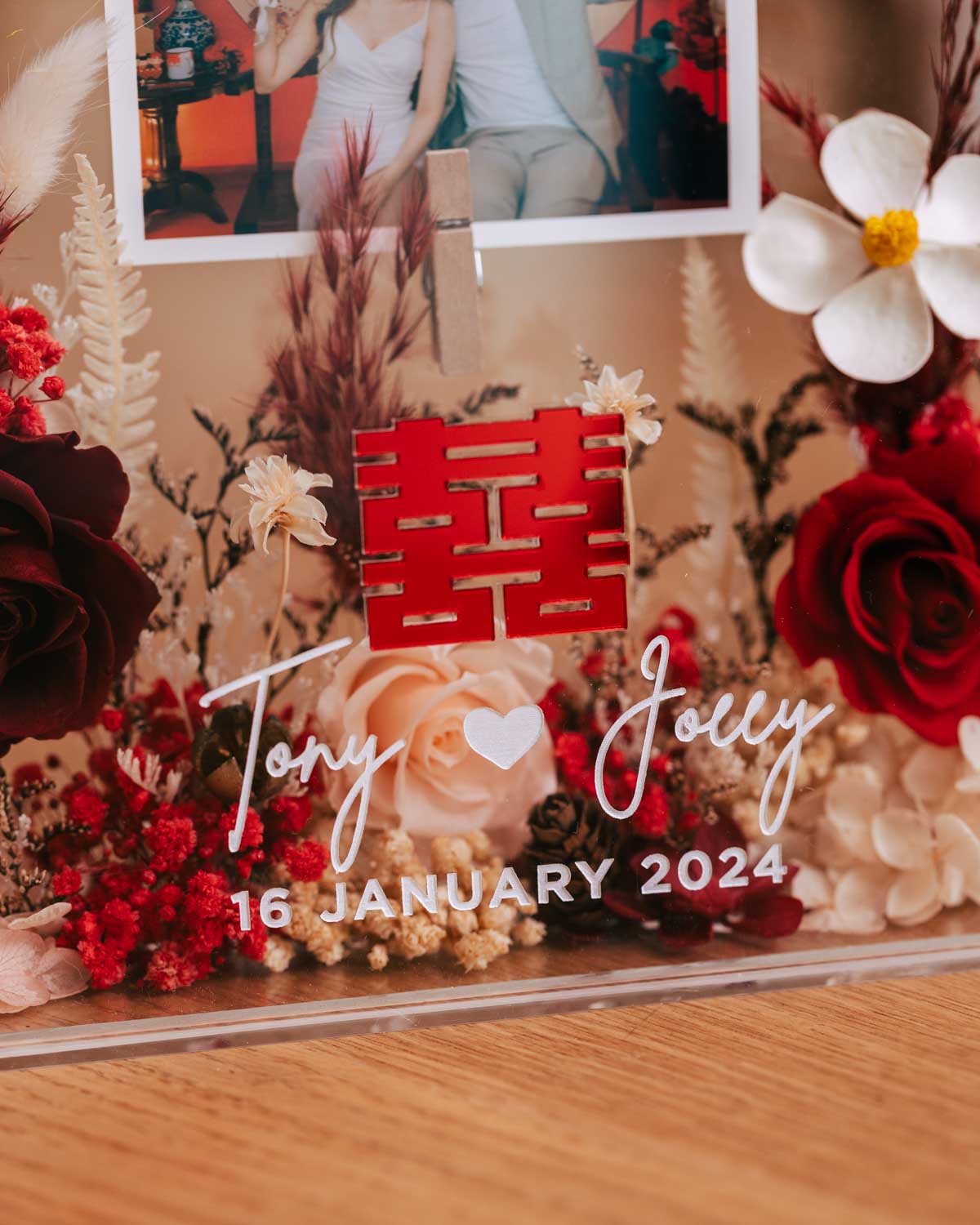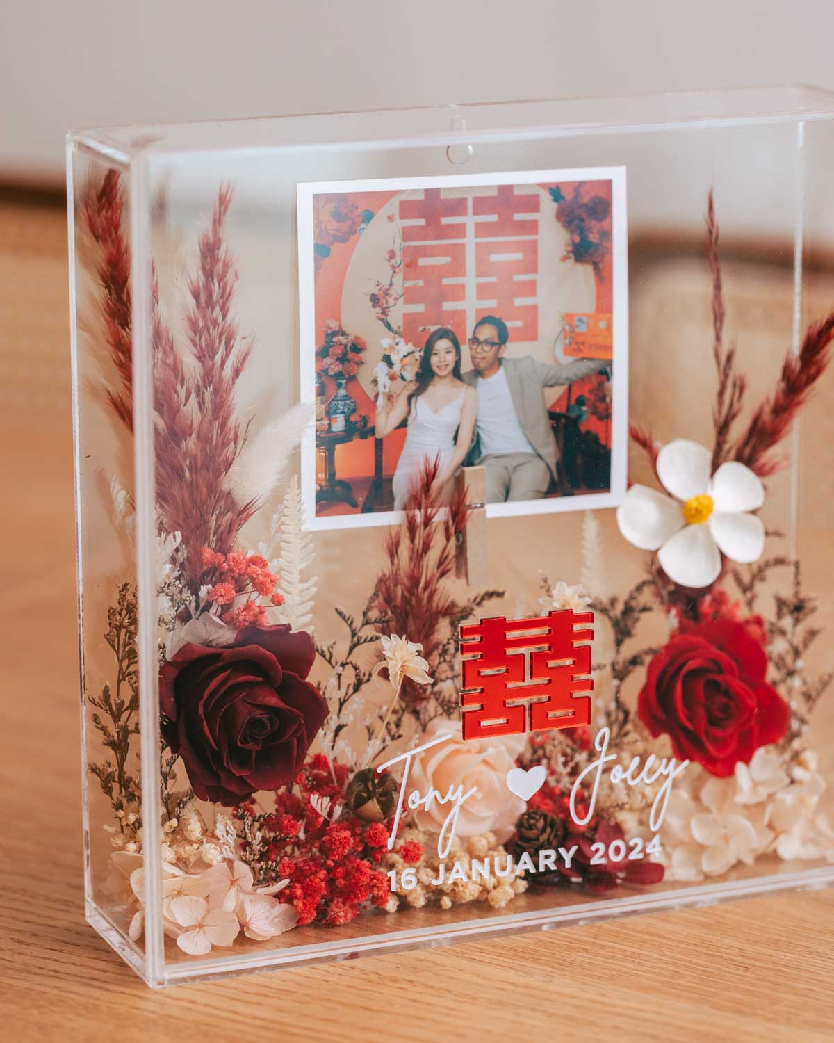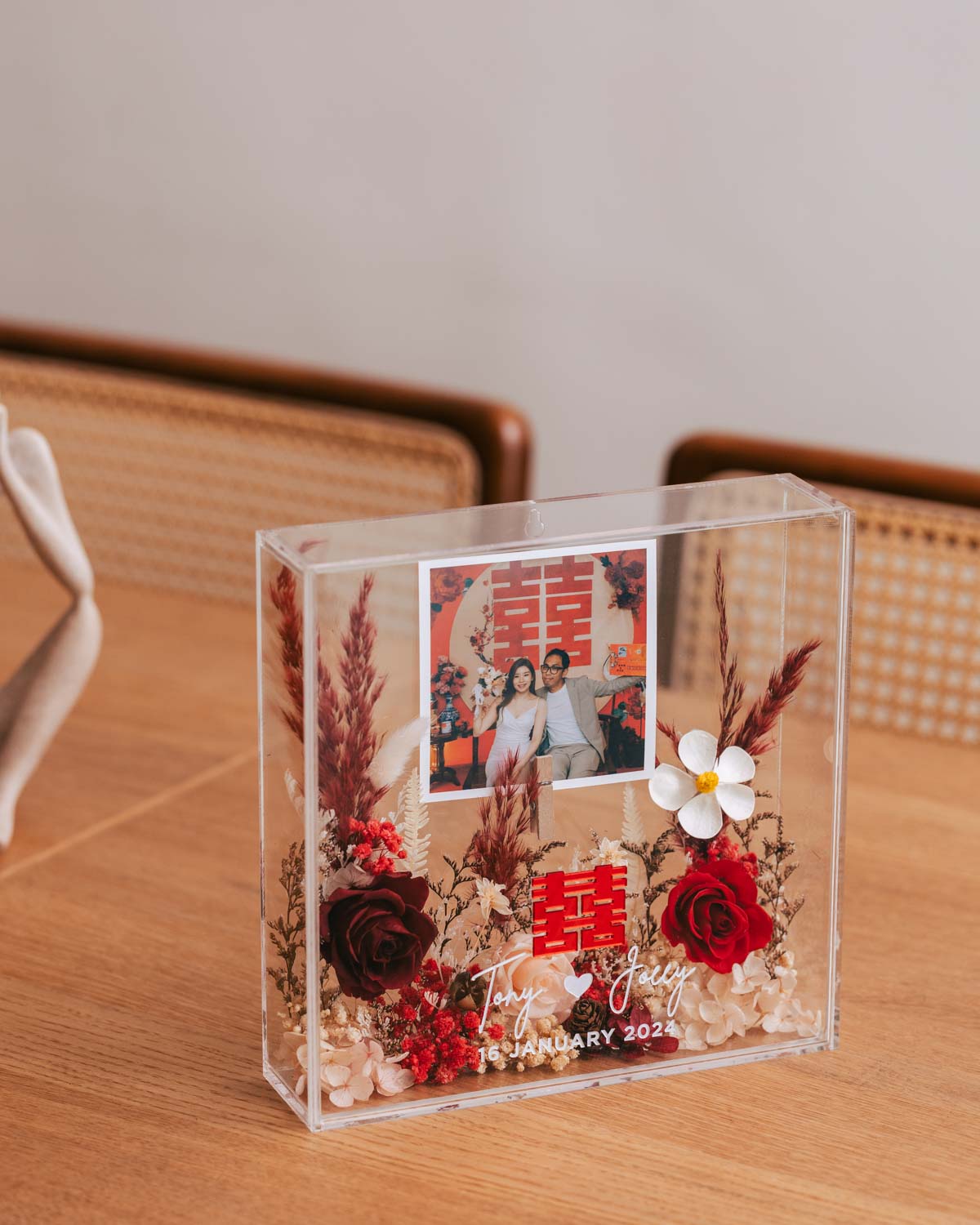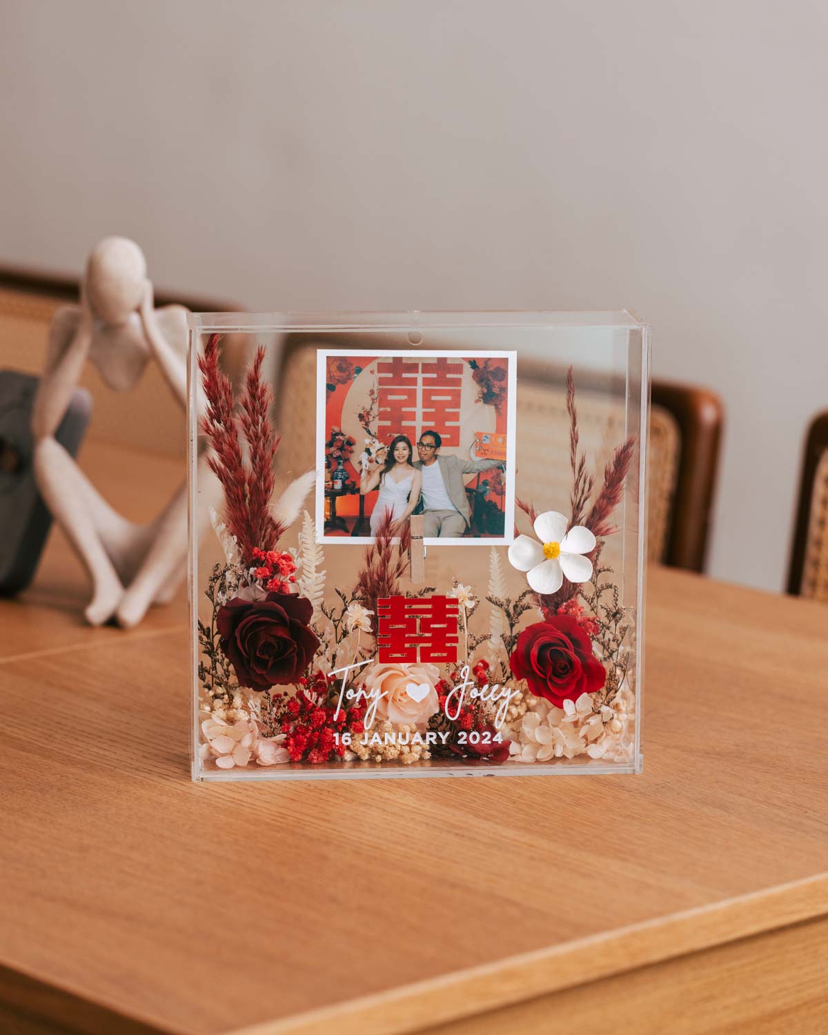 Preserved Flower Display: The focal point of our frame is the exquisite arrangement of preserved flowers, adding a touch of natural beauty and elegance to your displayed memories.