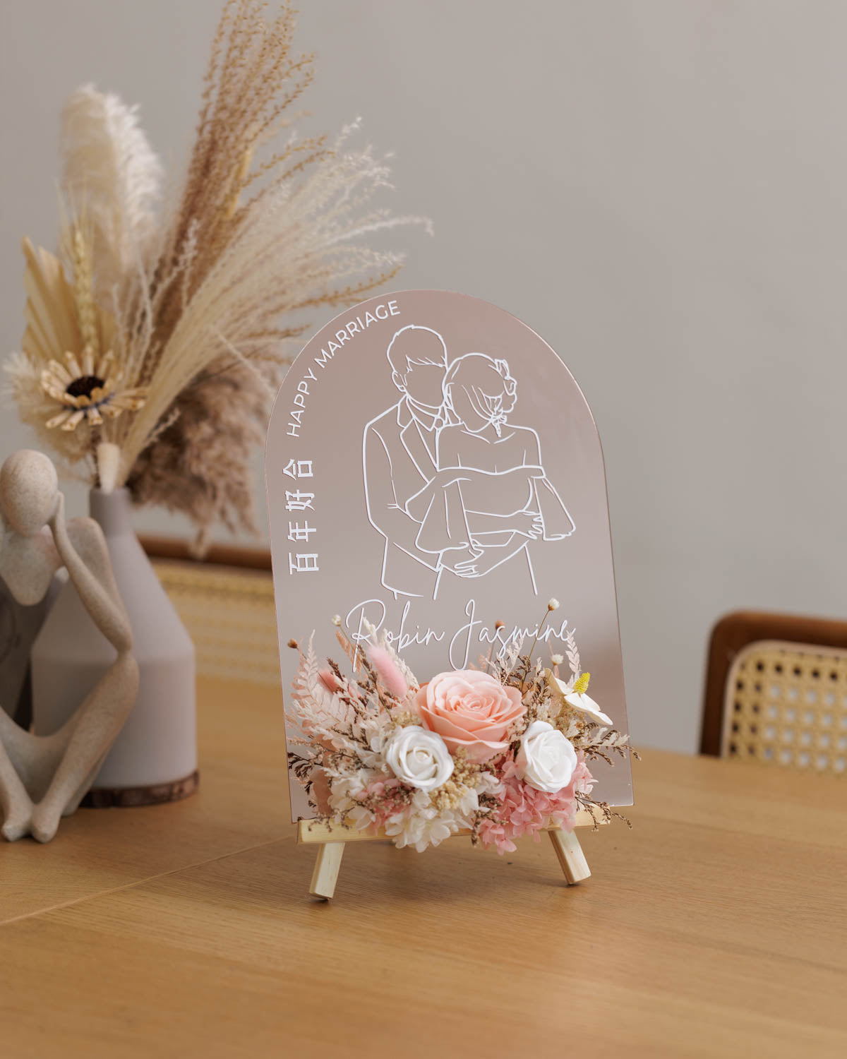 This Hand-drawn Portrait mirror acrylic features a beautifully rendered potrait draw, elegant acrylics plate, and intricate flower deco details. With its unique design and quality materials, this mirror is sure to add a touch of sophistication to any room while reflecting your personal style.