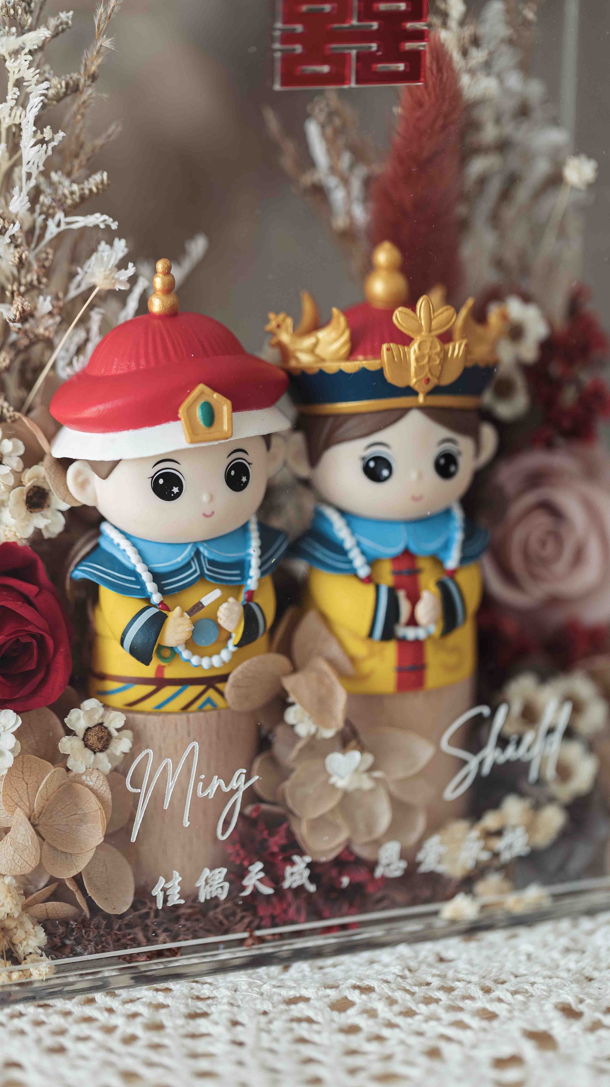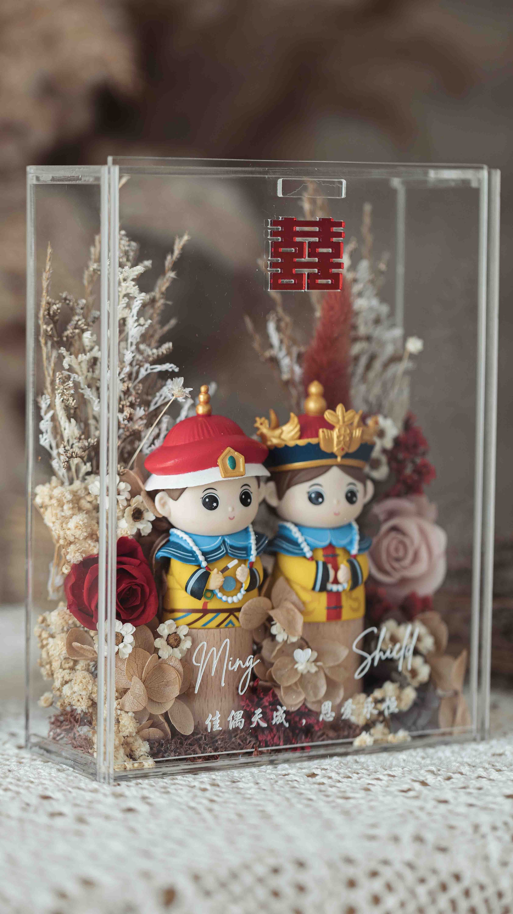 This charming wedding couple doll set is beautifully encased in an acrylic box, making it a perfect keepsake for newlyweds. The handcrafted figurines of the bride and groom are dressed in elegant attire, capturing the essence of love and celebration. Surrounding them is an exquisite floral arrangement in soft pastel tones, featuring delicate roses, hydrangeas, and dried botanicals that add a touch of natural beauty and romance. The personalized engraving at the front adds a sentimental touch, making this piece not only a wedding gift but a lasting symbol of the couple’s love story. This sophisticated display is a timeless reminder of a couple’s special day.