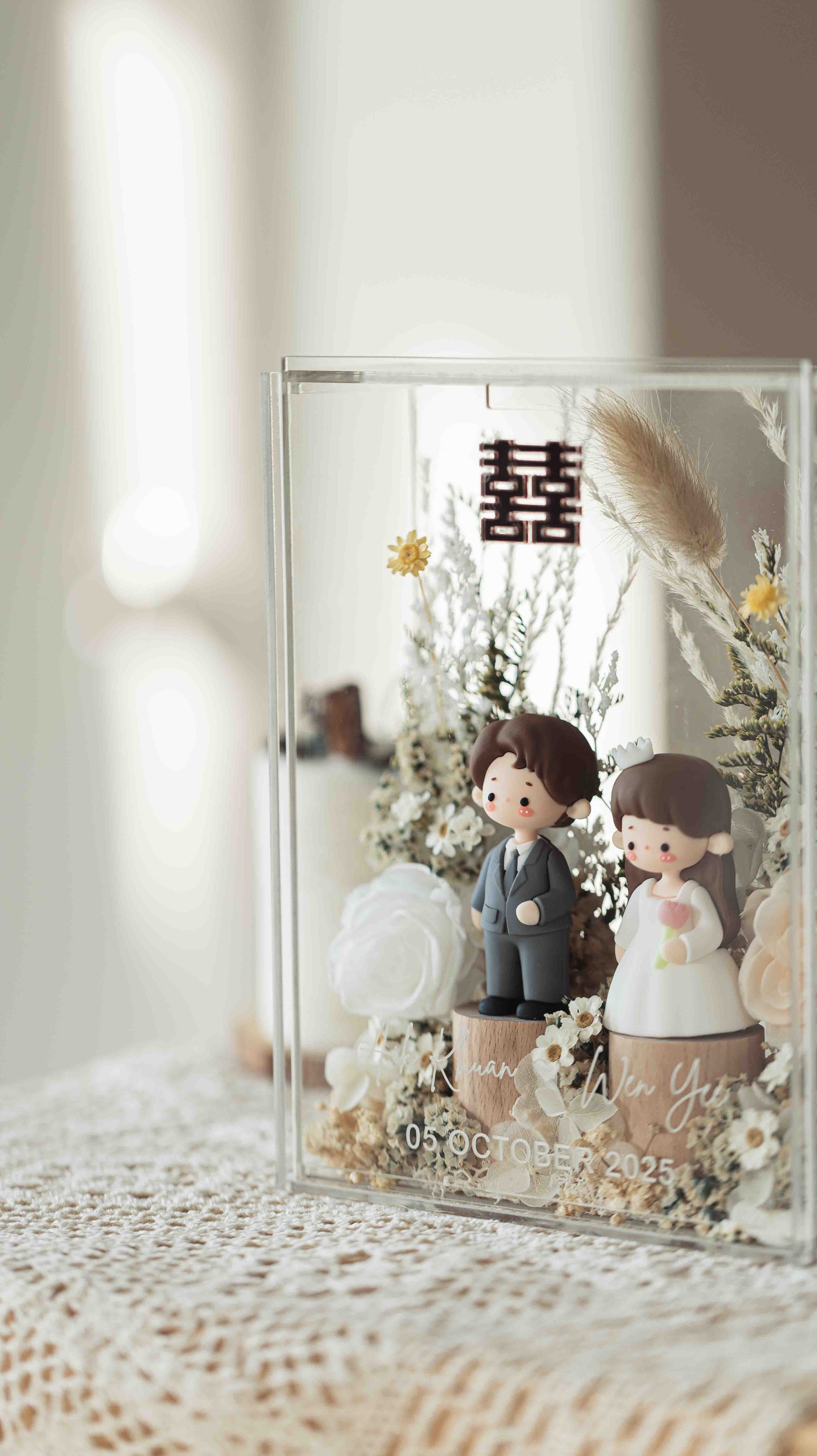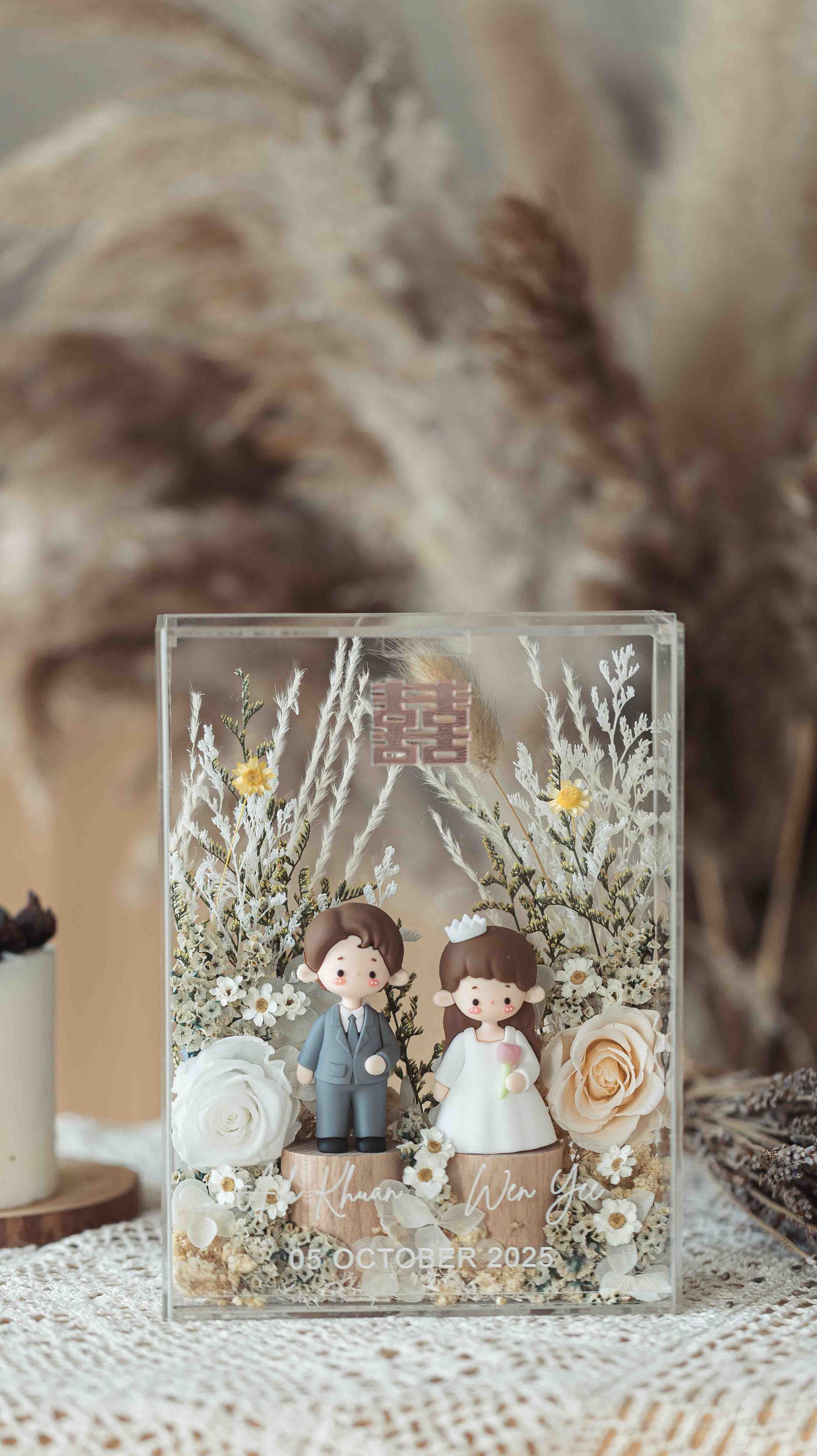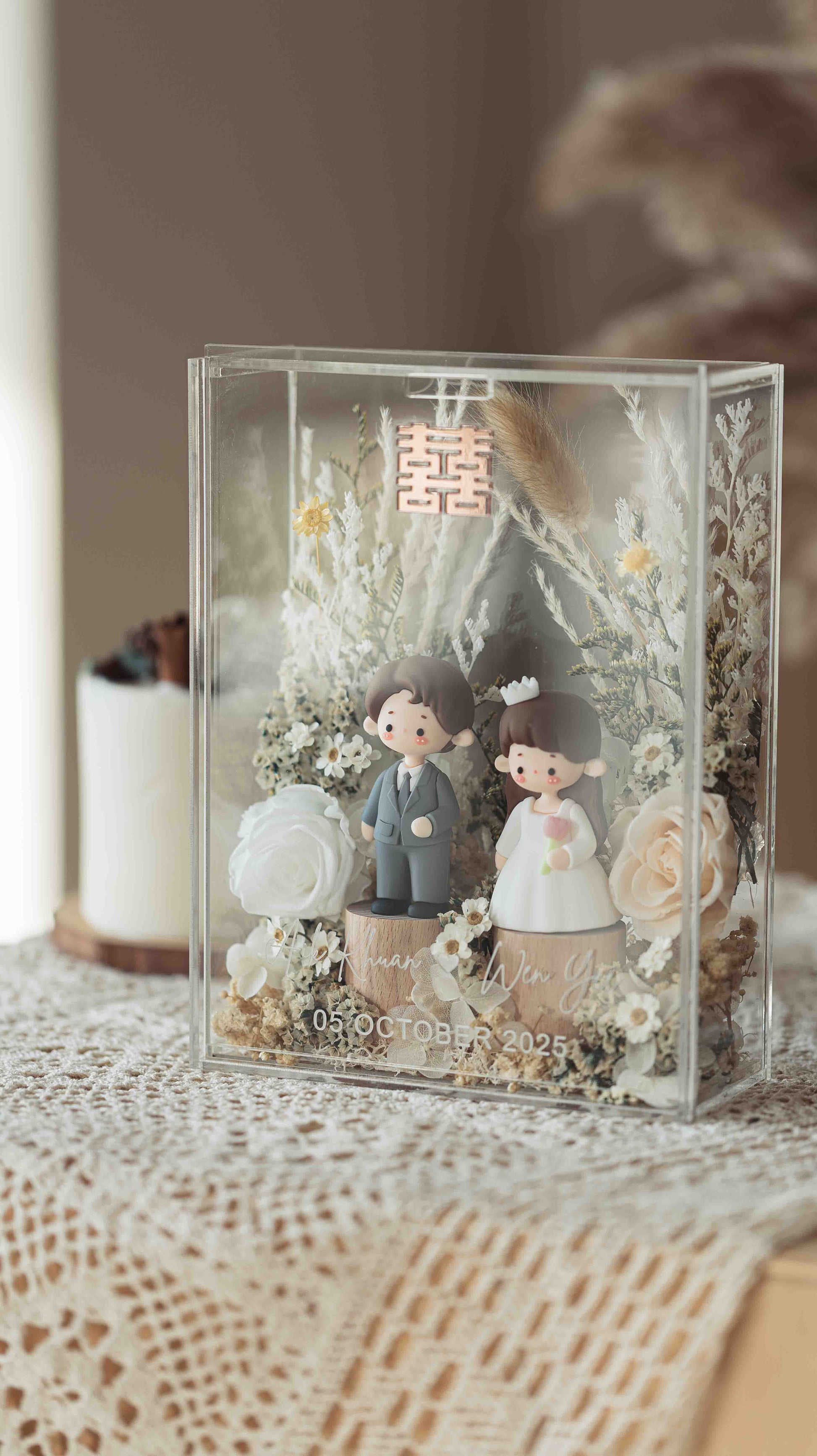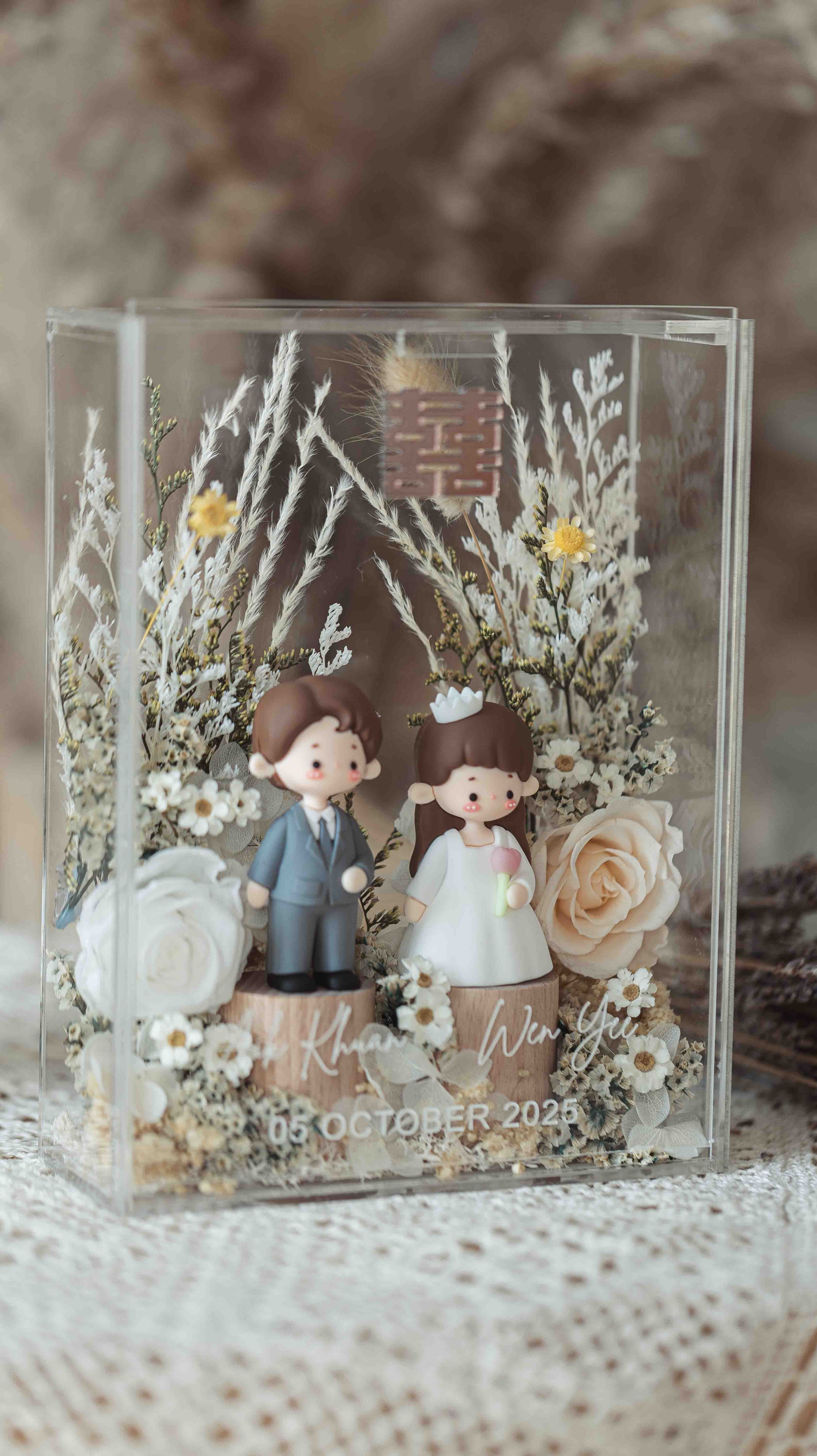 This charming wedding couple doll set is beautifully encased in an acrylic box, making it a perfect keepsake for newlyweds. The handcrafted figurines of the bride and groom are dressed in elegant attire, capturing the essence of love and celebration. Surrounding them is an exquisite floral arrangement in soft pastel tones, featuring delicate roses, hydrangeas, and dried botanicals that add a touch of natural beauty and romance. The personalized engraving at the front adds a sentimental touch, making this piece not only a wedding gift but a lasting symbol of the couple’s love story. This sophisticated display is a timeless reminder of a couple’s special day.