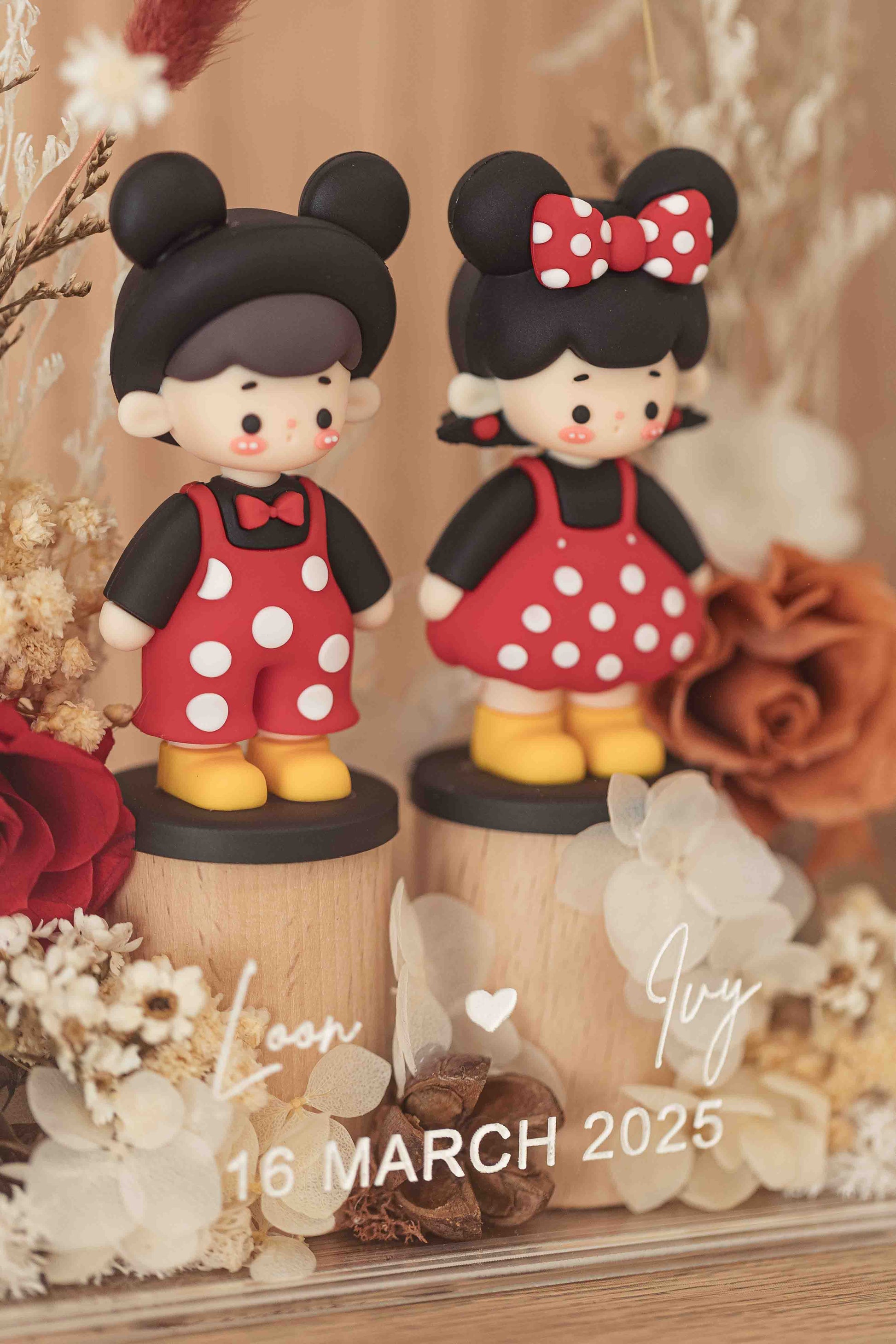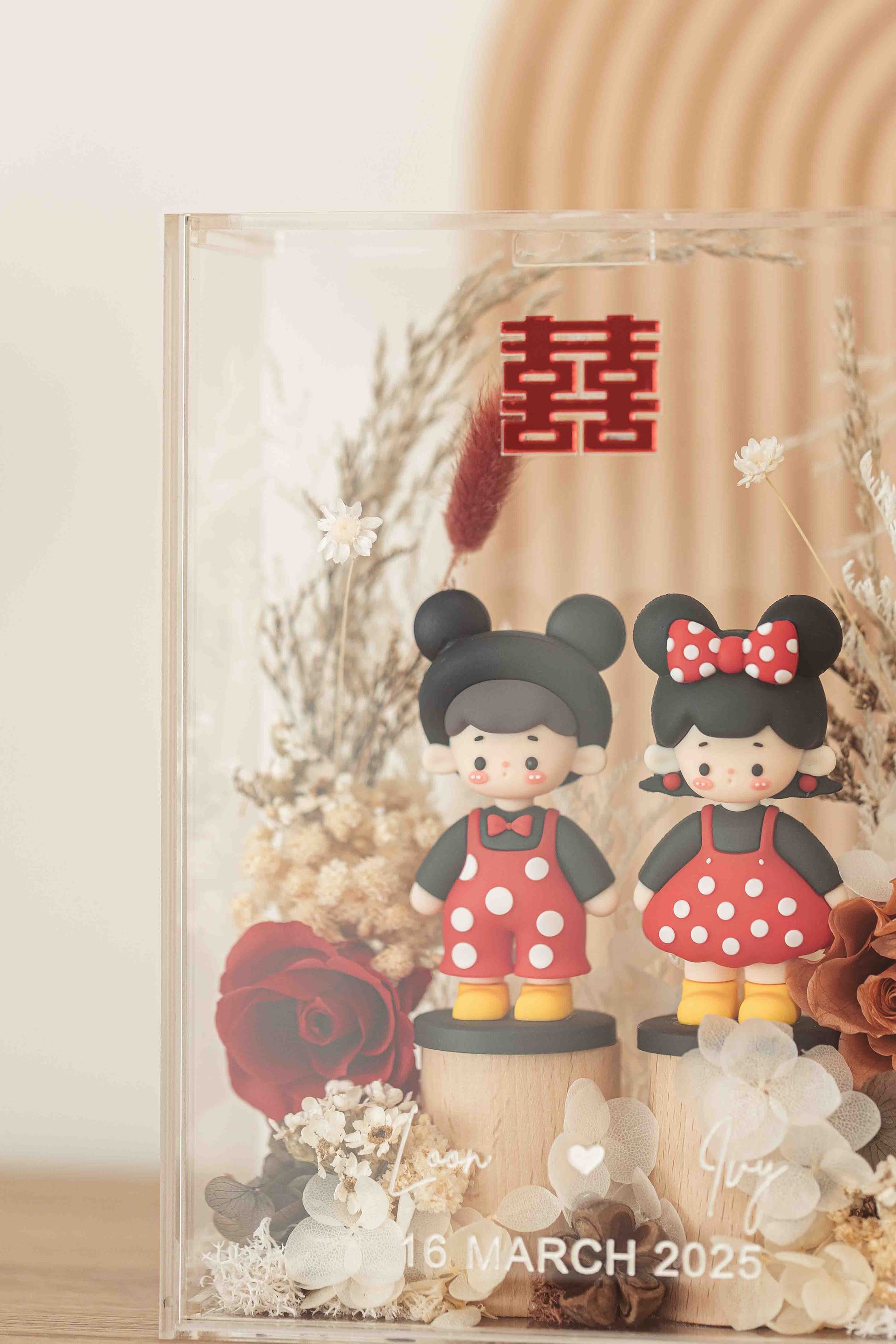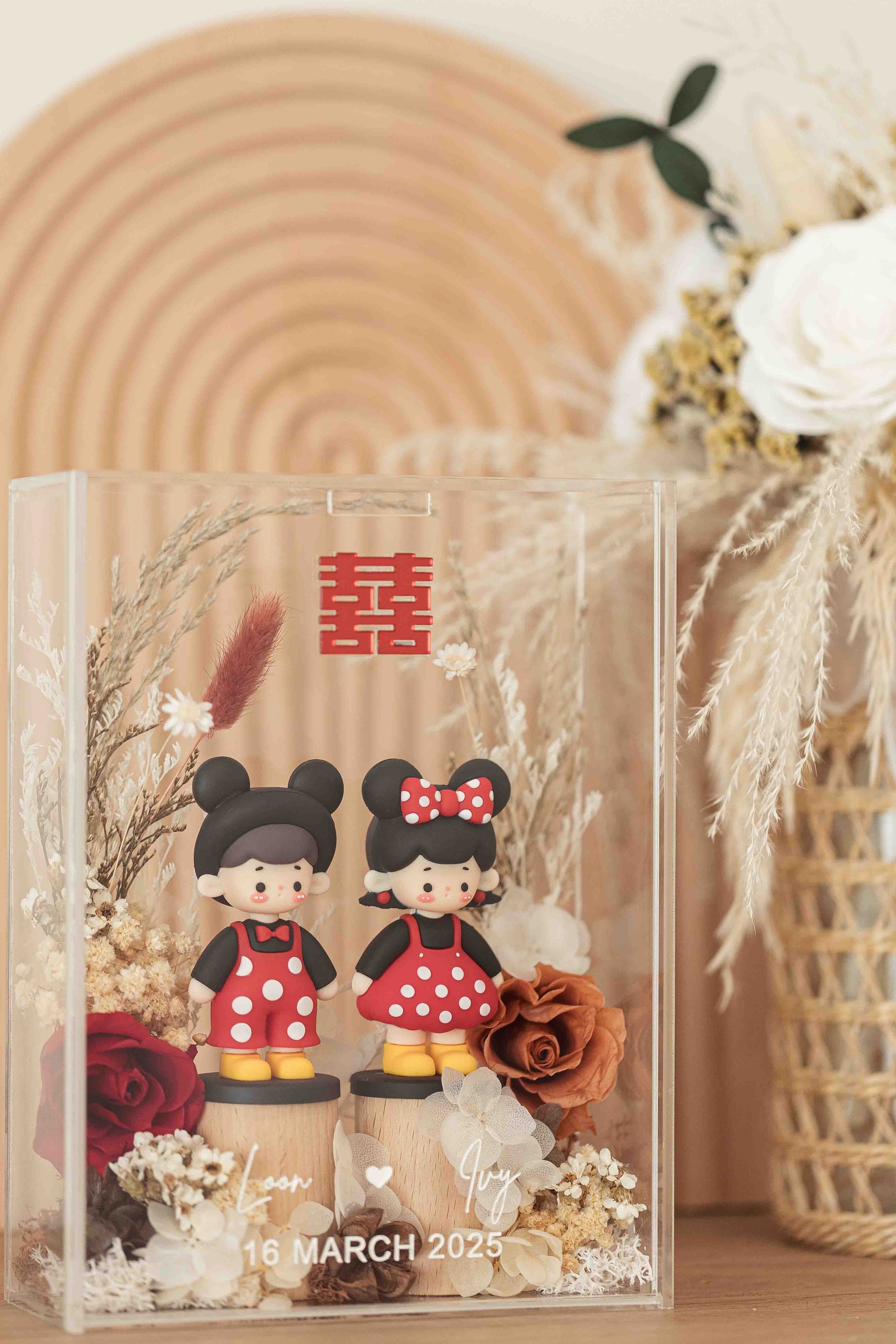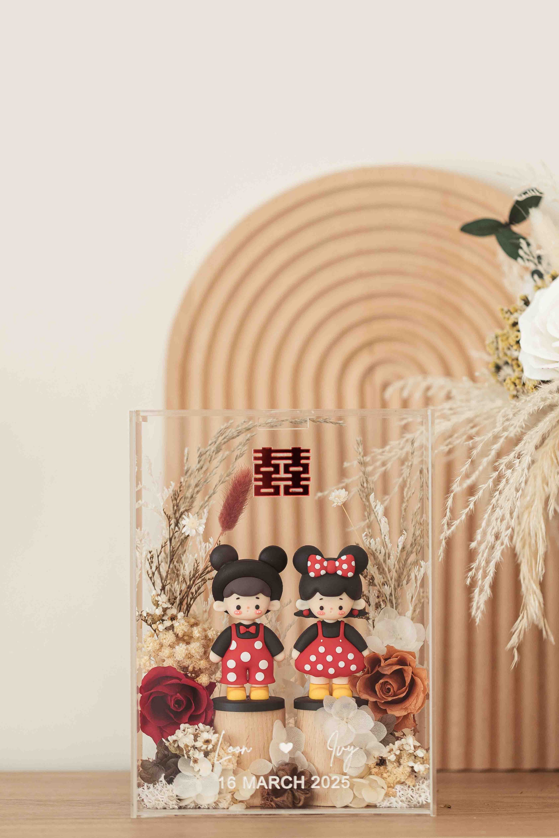 Celebrate love with our Lys & Ro Pair collection, a handcrafted masterpiece designed to honor the union of two souls. This personalized wedding keepsake features adorable miniature bride and groom figurines, delicately placed amidst preserved flowers and elegant greenery.