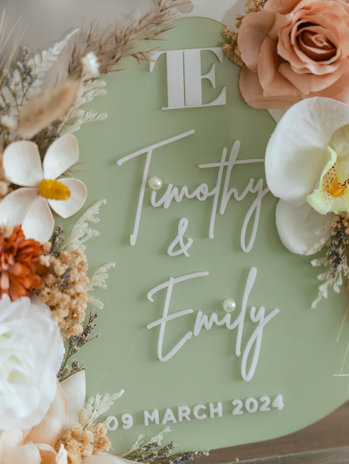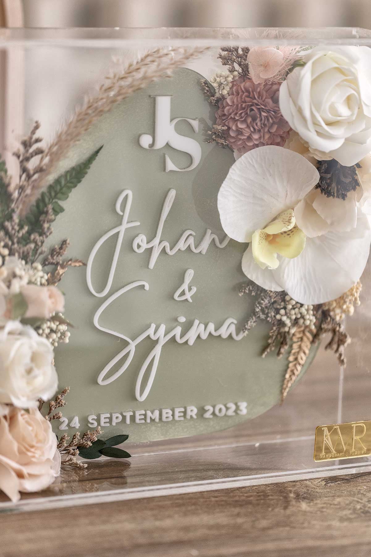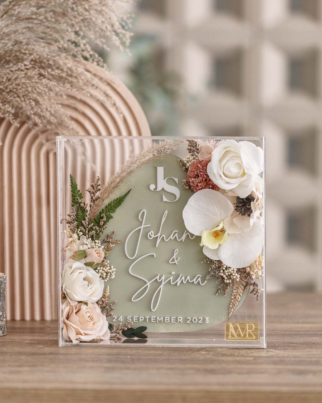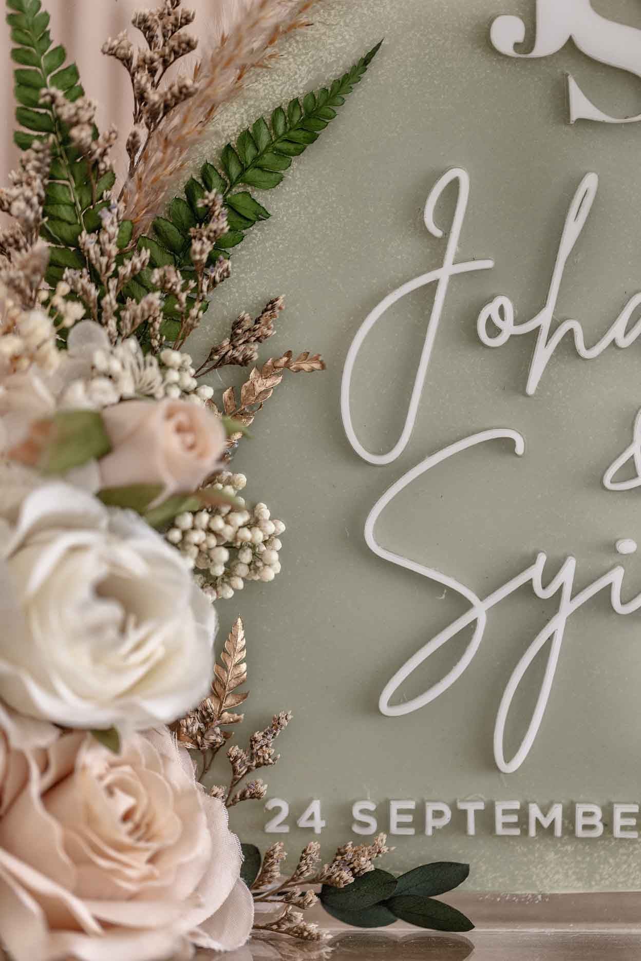 Elevate your wedding decor with our exquisite square acrylic frame, delicately adorned with vibrant red roses and shimmering gold leaves encircling the names of the happy couple. Featuring captivating red flowers and opulent golden elements atop, this stunning piece adds a touch of romance and luxury to your special day. Order now to add an unforgettable flourish to your wedding celebration!