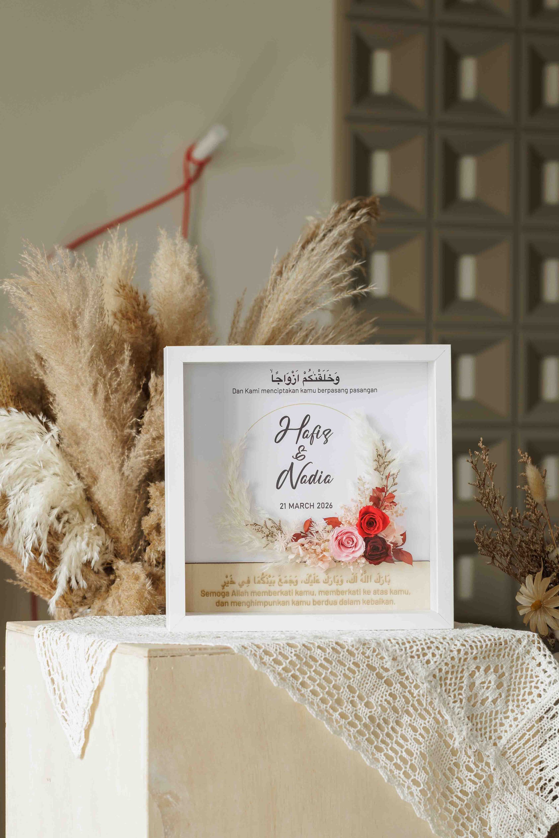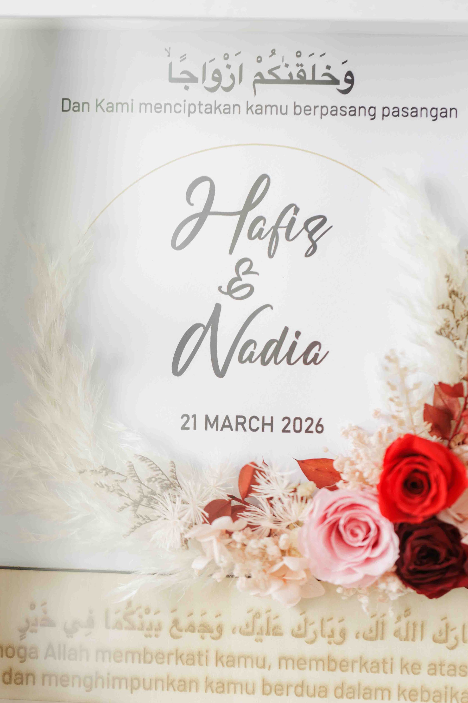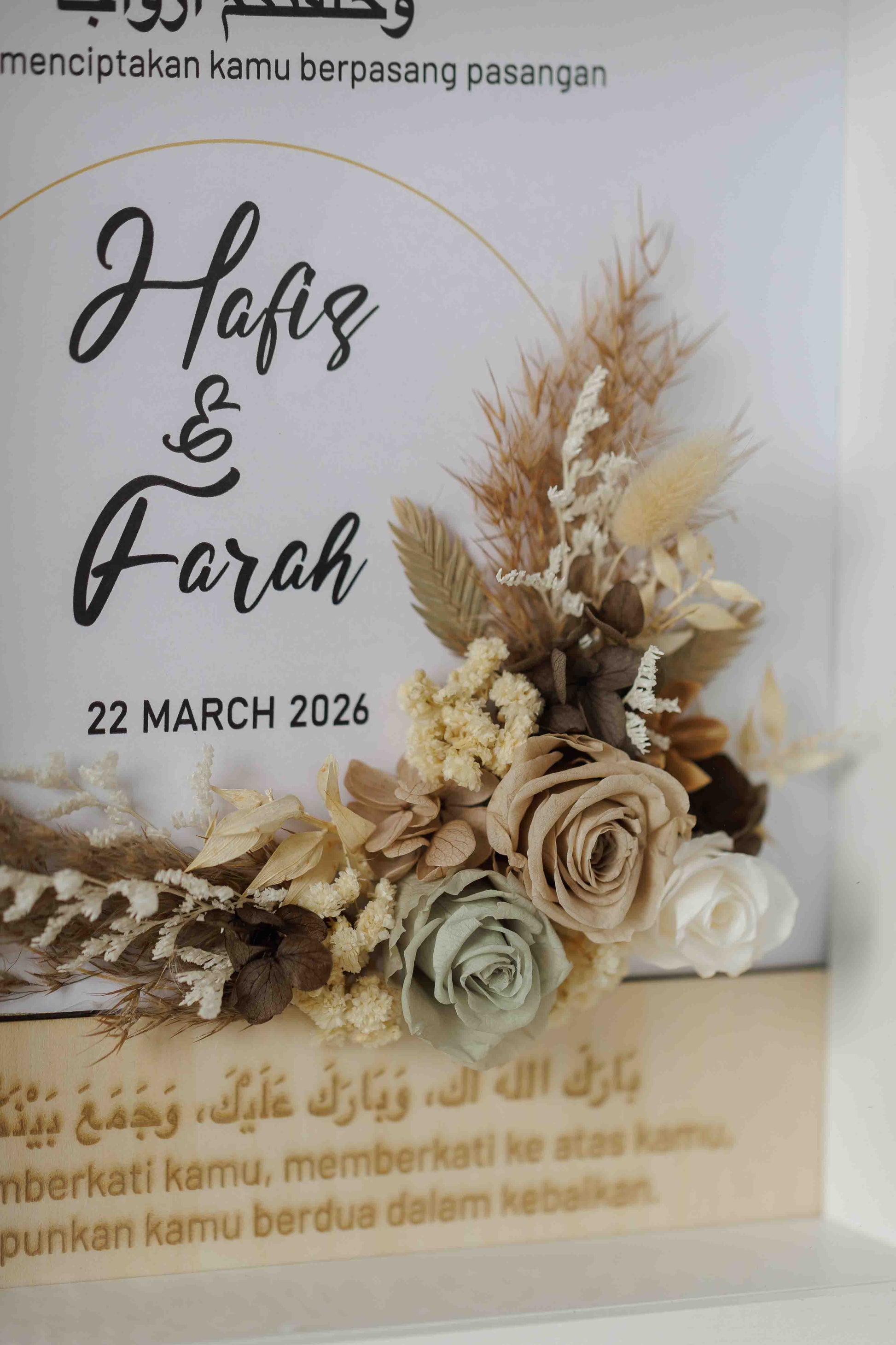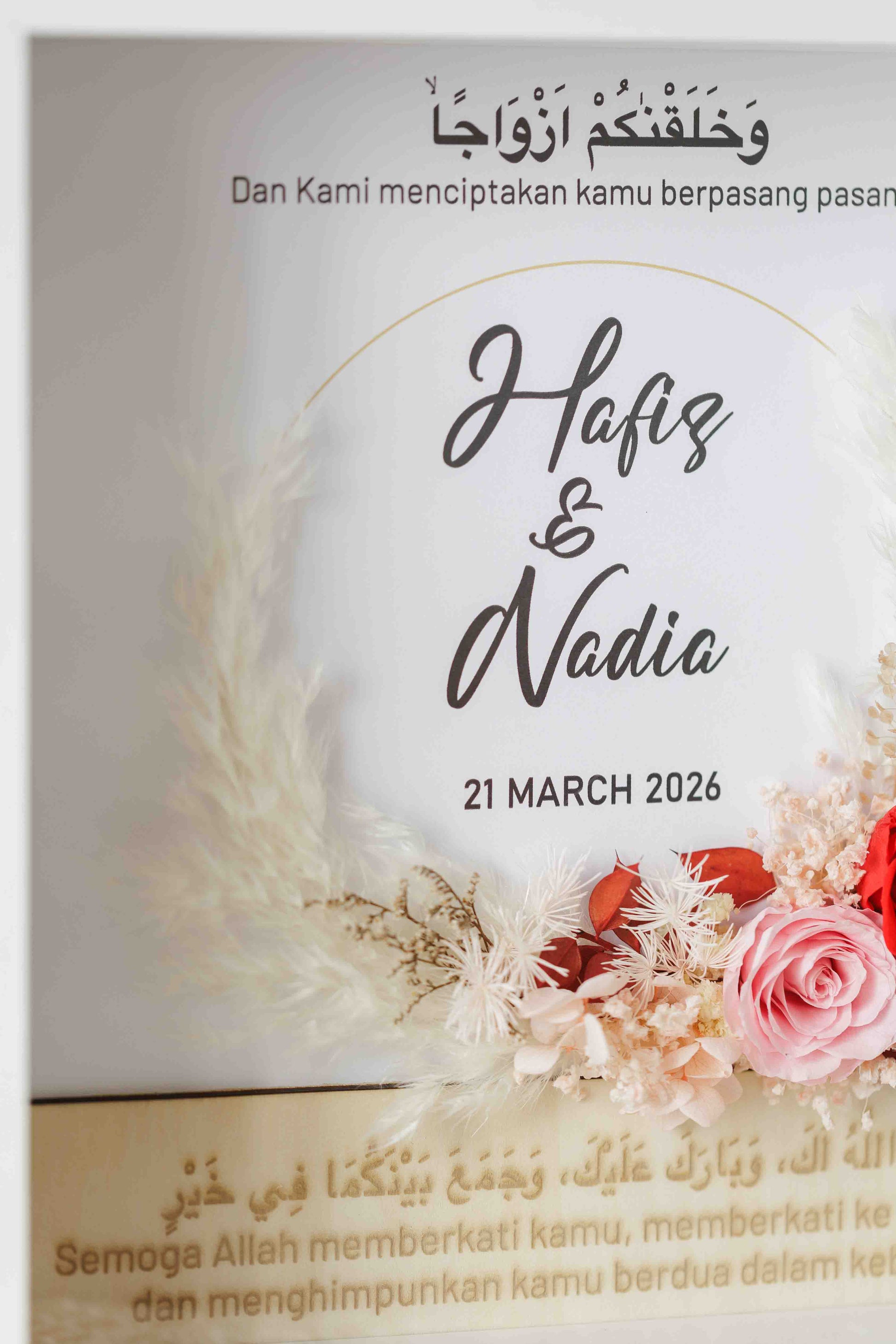 • Personalised couple’s names displayed beneath the calligraphy