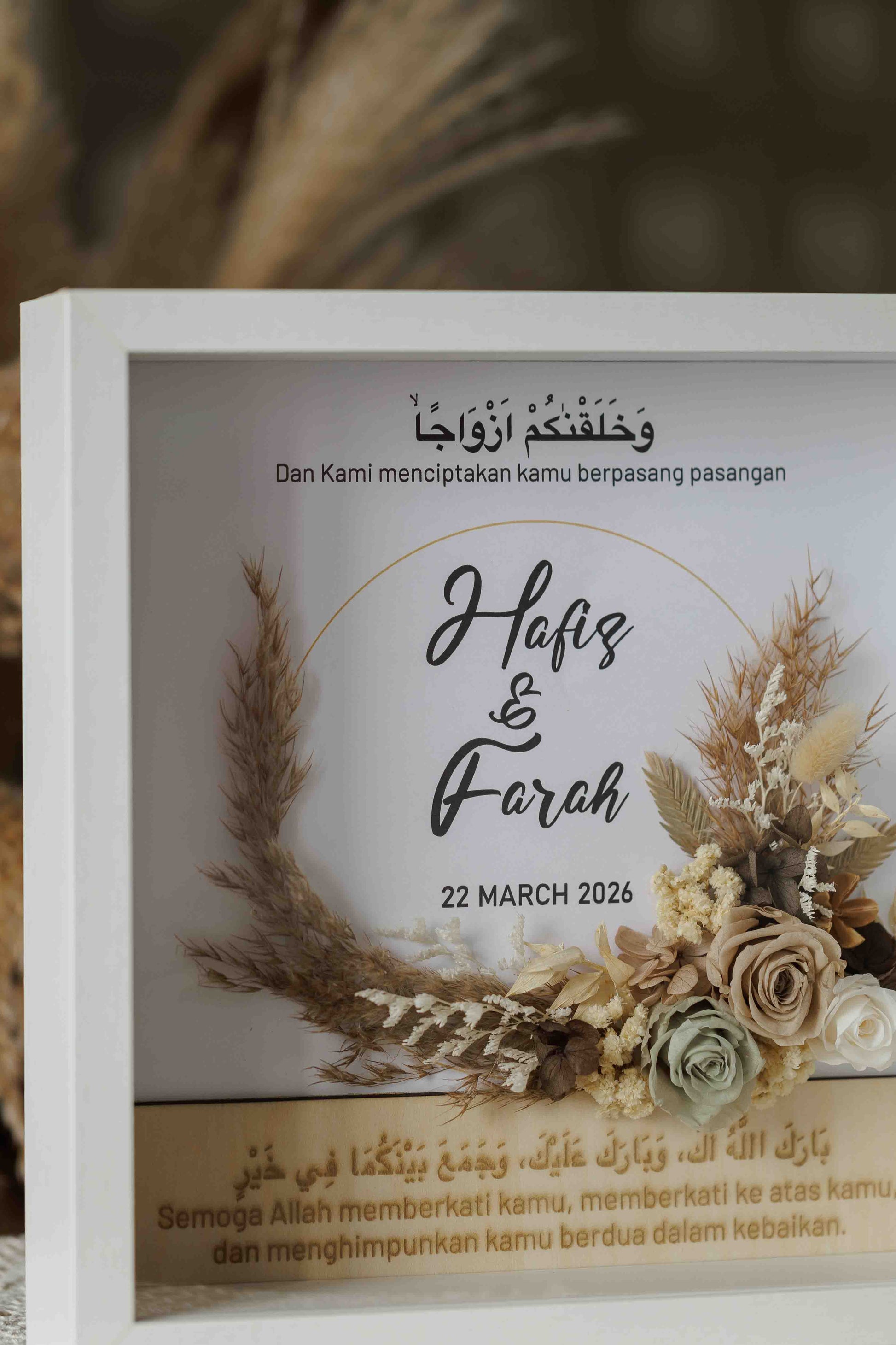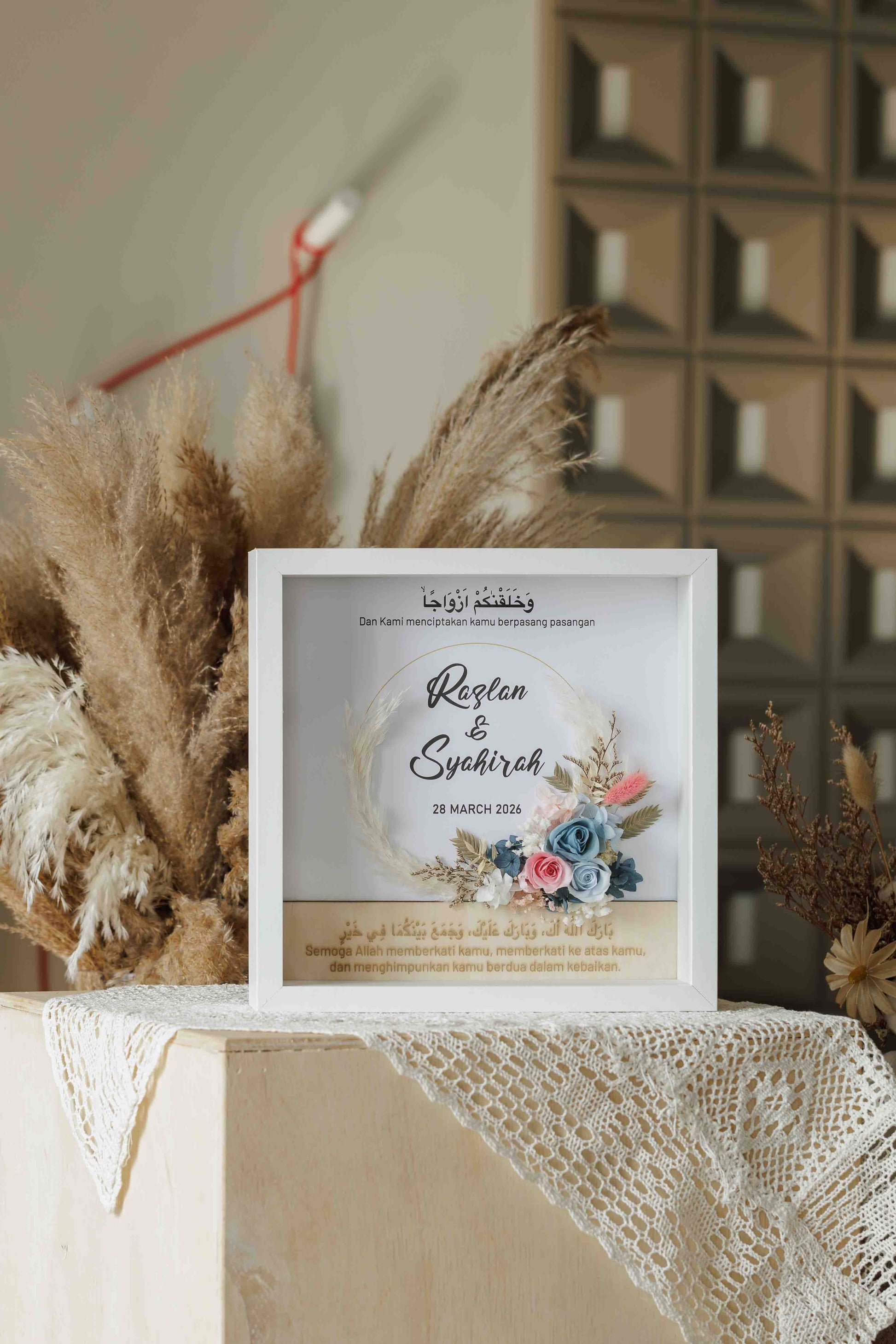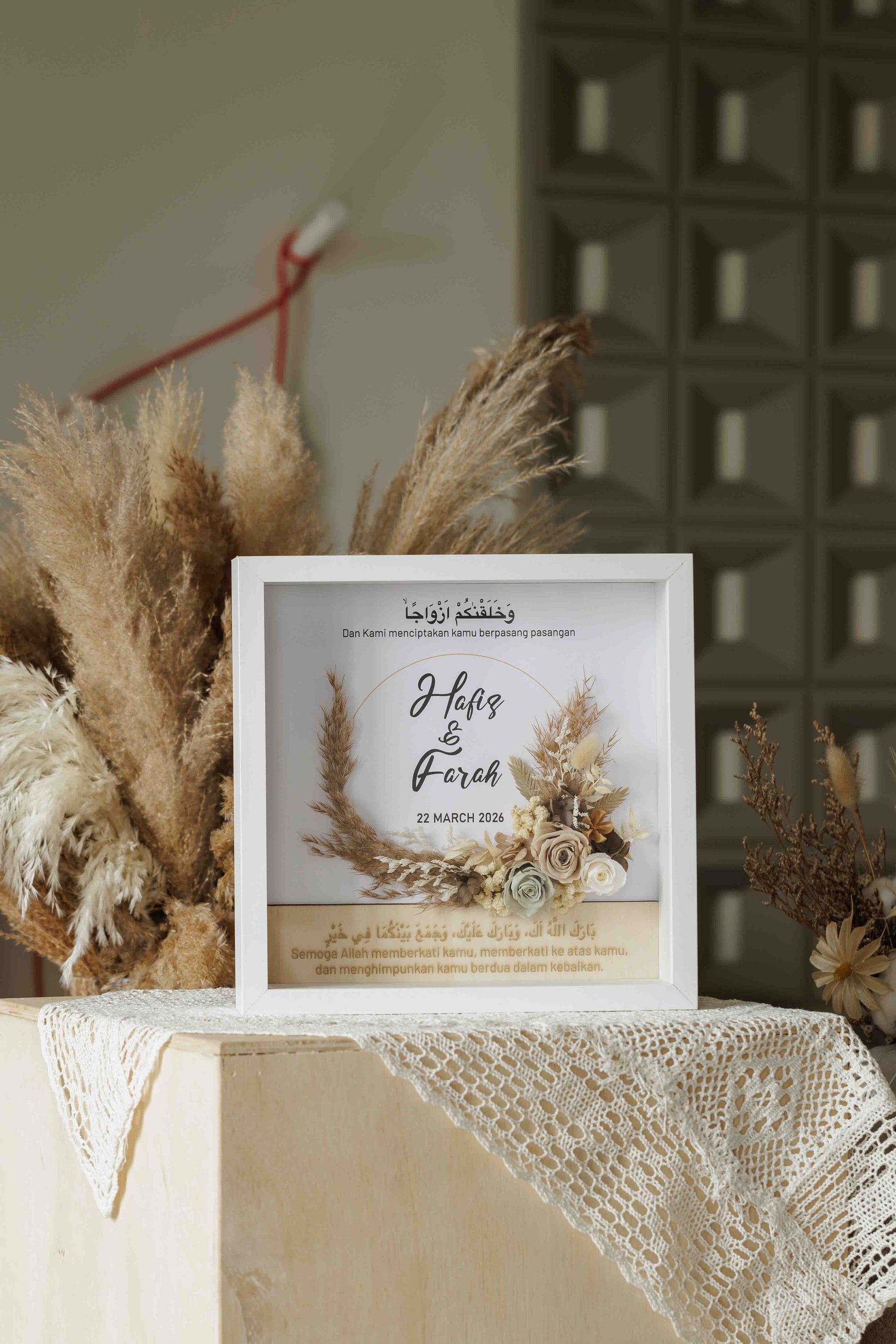 • Personalised couple’s names displayed beneath the calligraphy