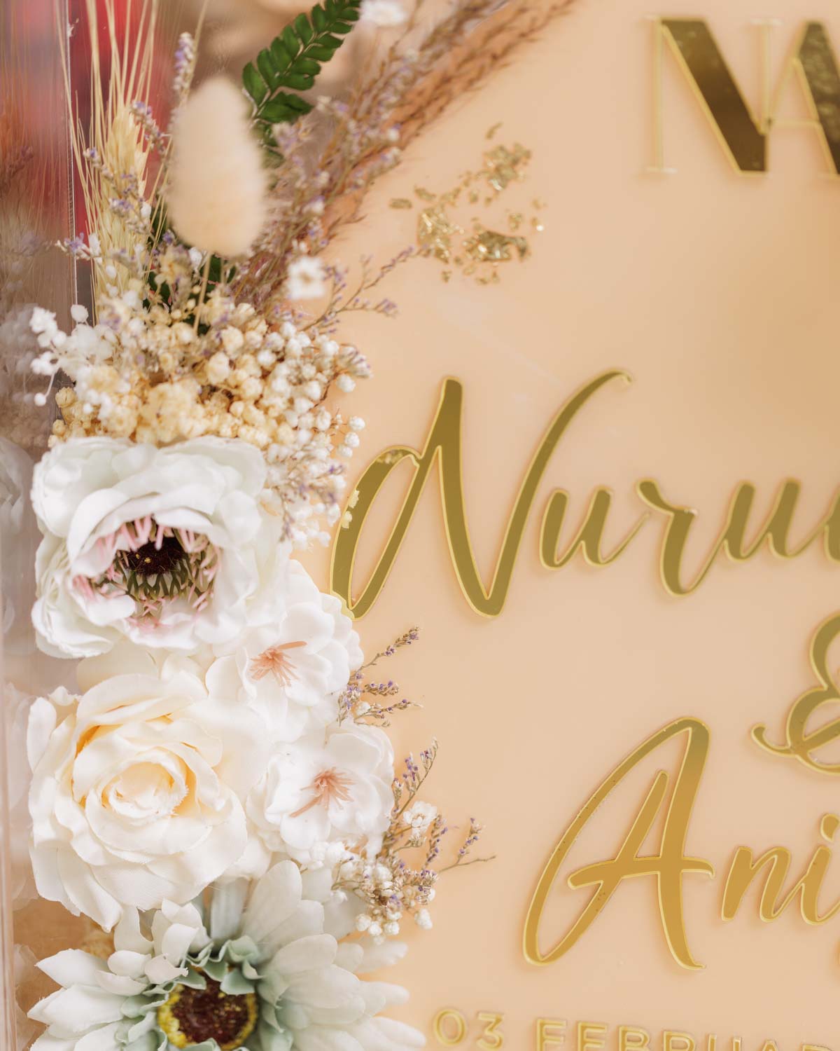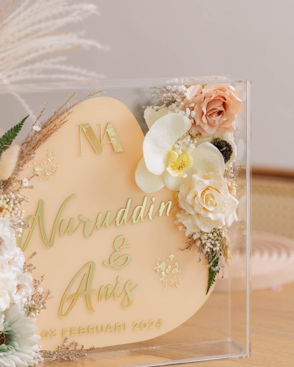 Elevate your wedding decor with our exquisite square acrylic frame, delicately adorned with vibrant red roses and shimmering gold leaves encircling the names of the happy couple. Featuring captivating red flowers and opulent golden elements atop, this stunning piece adds a touch of romance and luxury to your special day. Order now to add an unforgettable flourish to your wedding celebration!