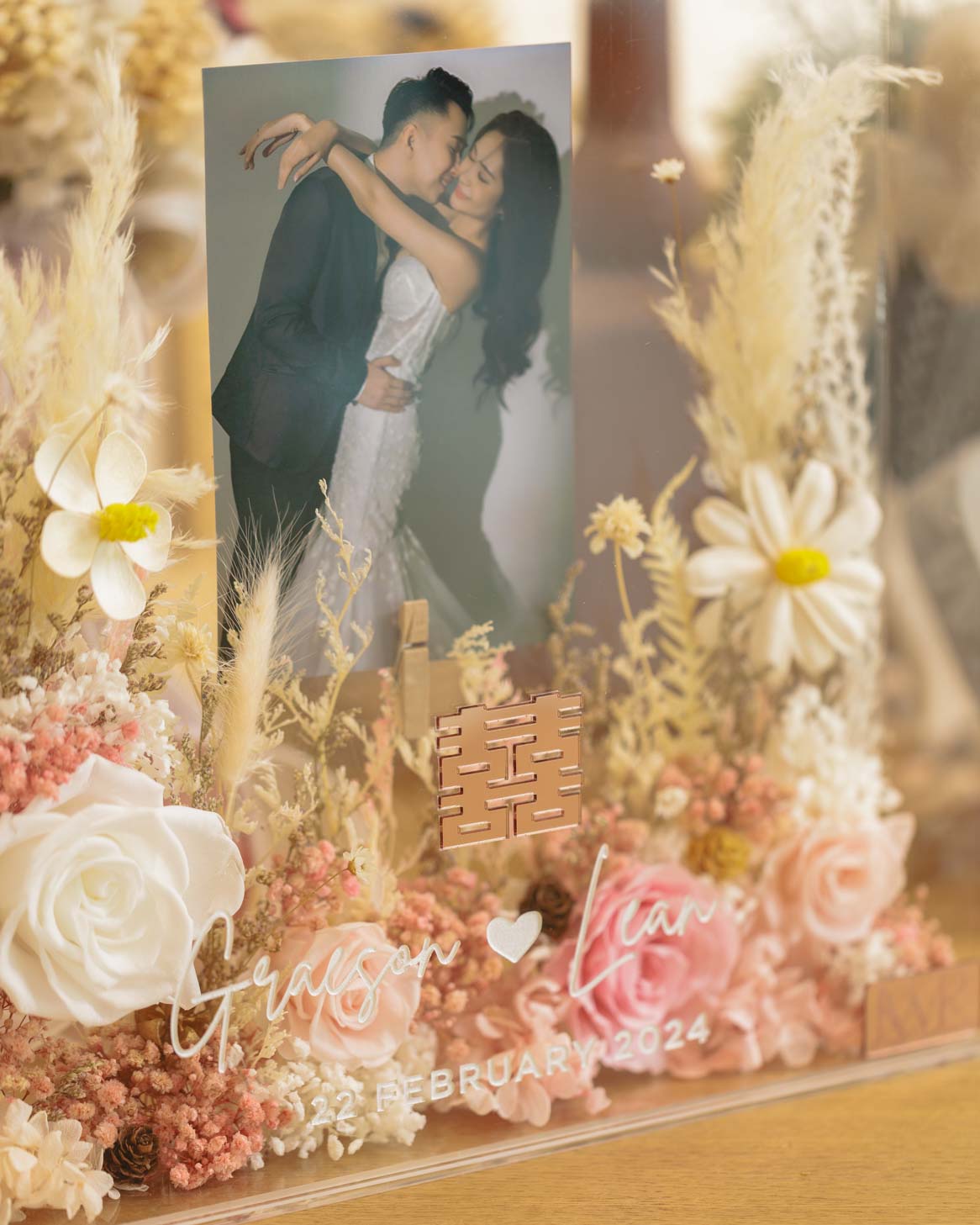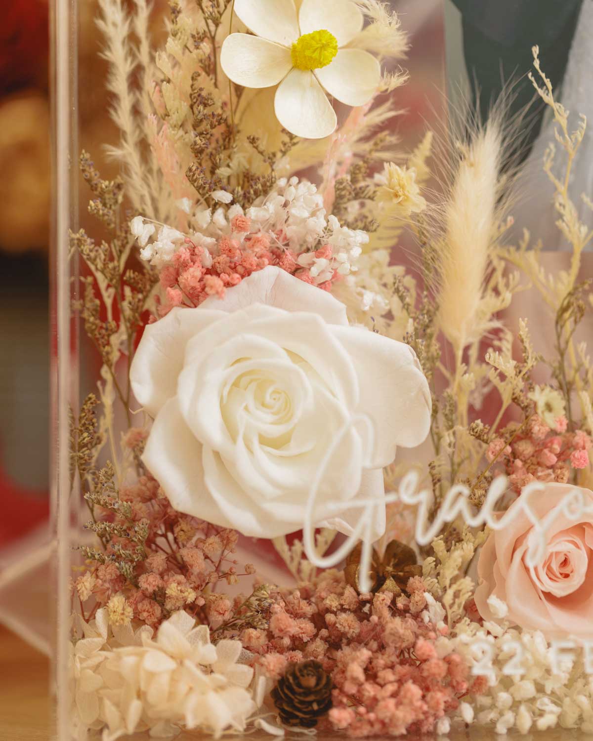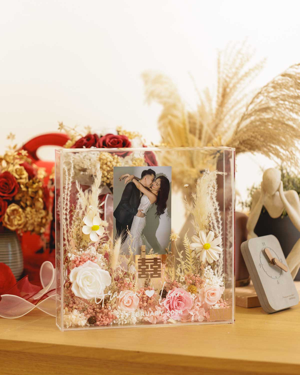 Preserved Flower Display: The focal point of our frame is the exquisite arrangement of preserved flowers, adding a touch of natural beauty and elegance to your displayed memories.