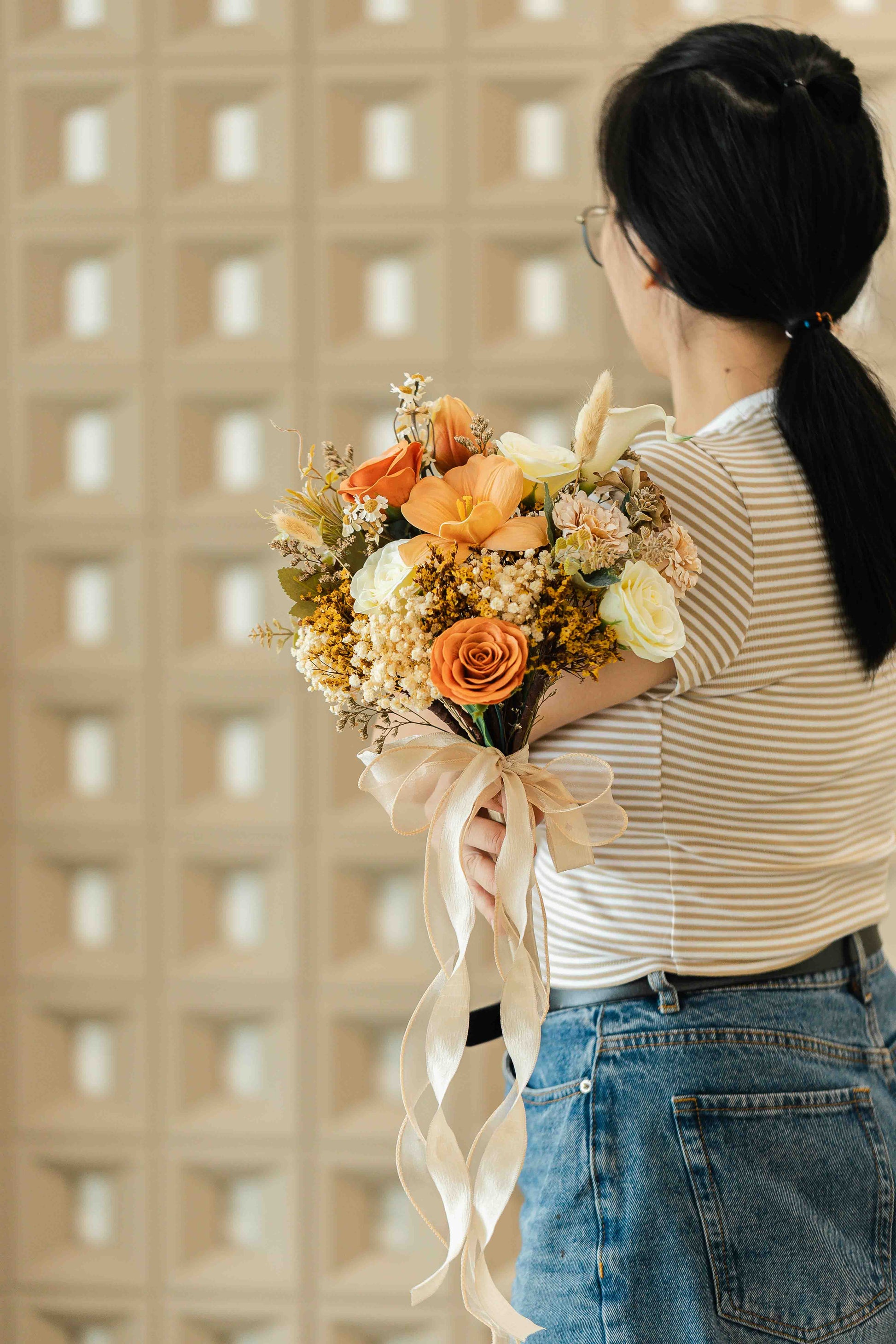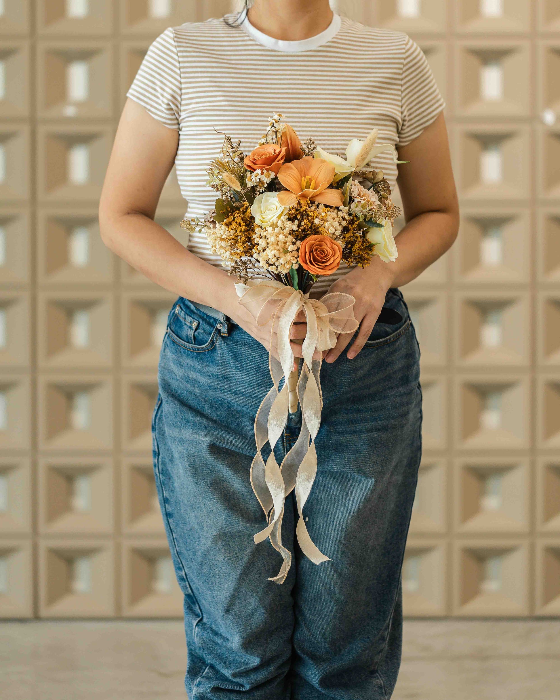 Capture the warm, earthy tones of autumn with our Rustic Autumn Bouquet. Featuring a stunning mix of orange, ivory, and golden preserved flowers, this bouquet exudes natural charm and rustic elegance. The delicate arrangement is tied together with a soft, flowing ribbon, adding a touch of romance.
