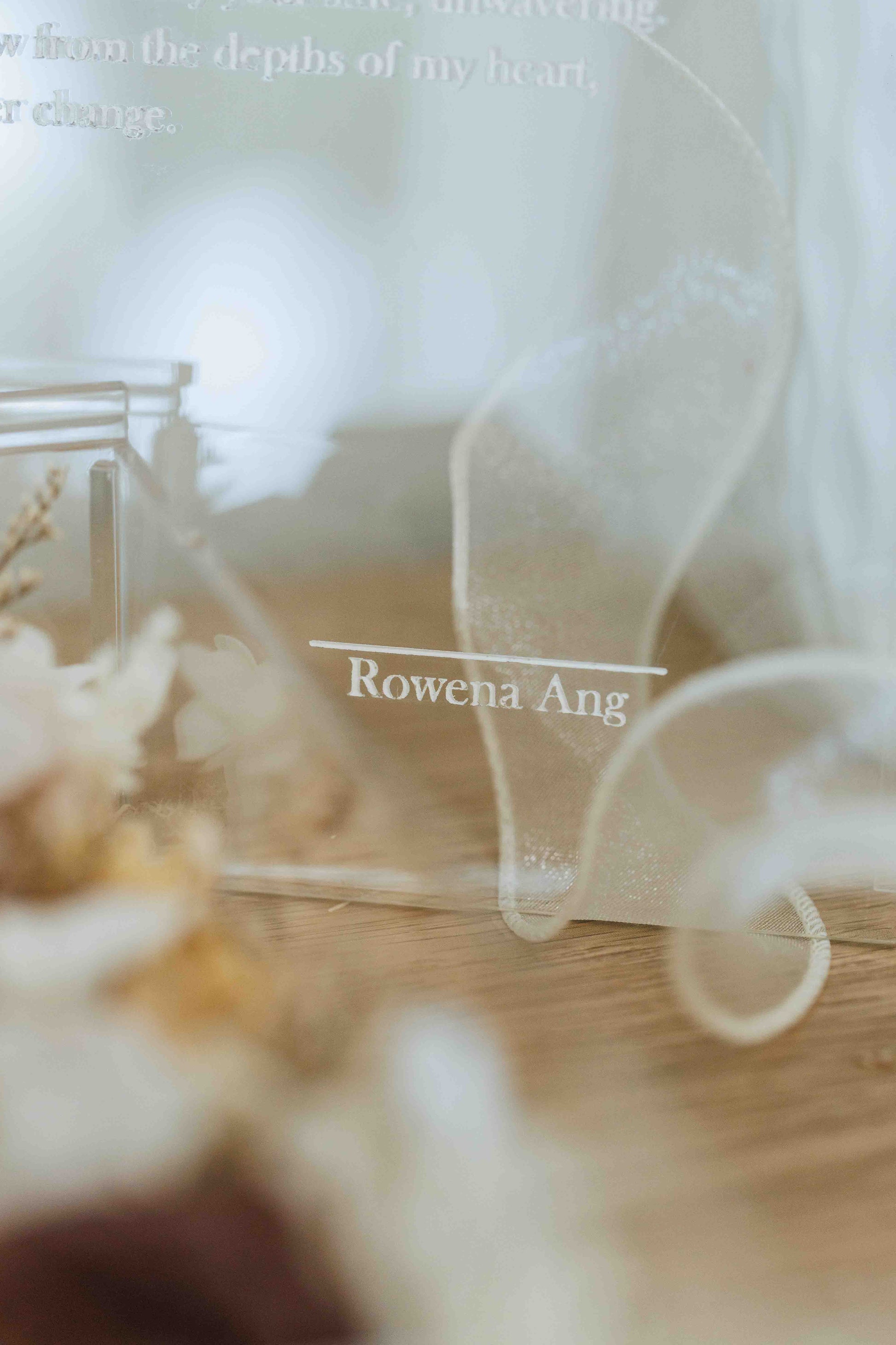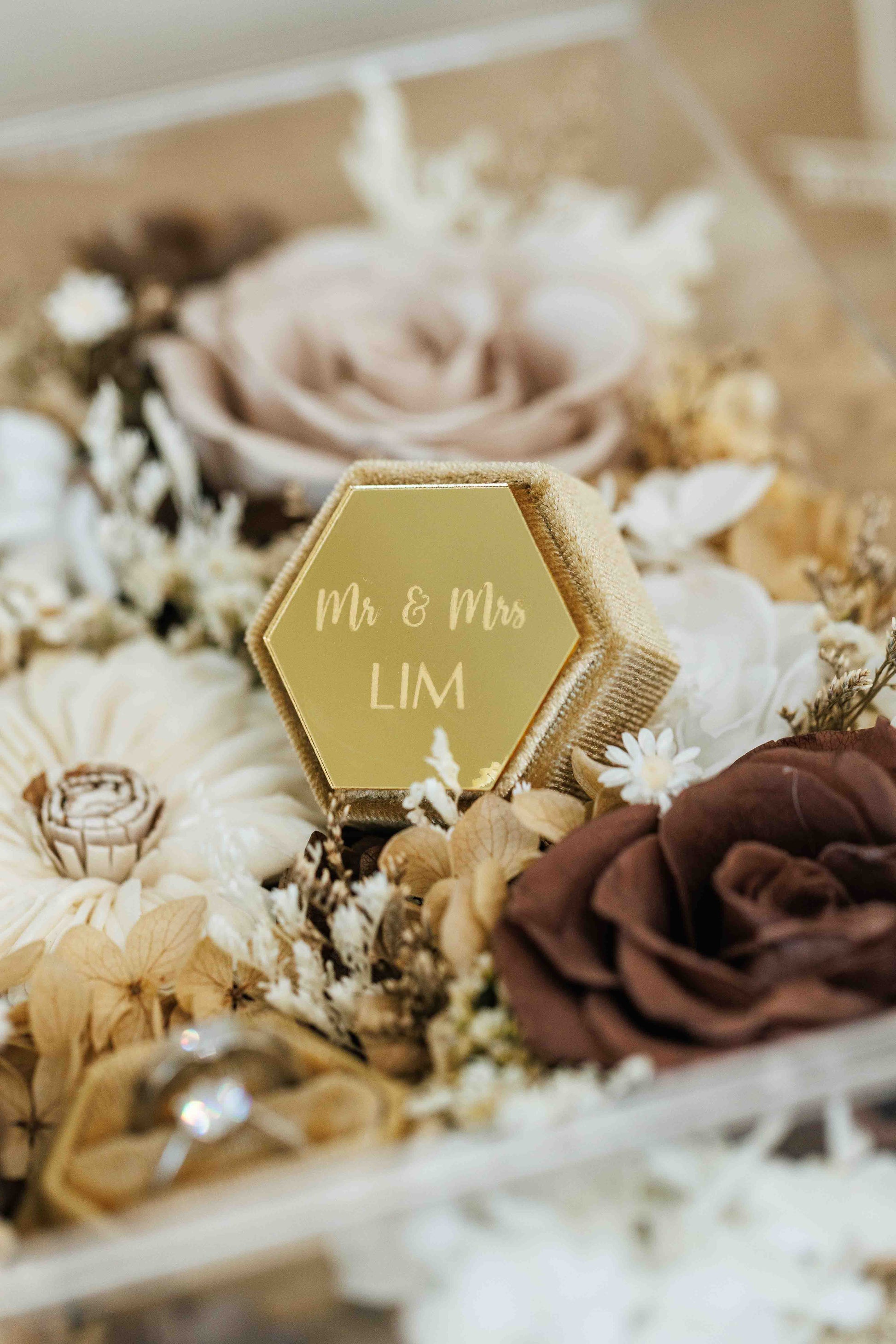 This elegant piece features a stunning arrangement of neutral-toned, preserved flowers, thoughtfully curated to represent enduring love and commitment. The couple’s names and wedding date are carefully inscribed, making this a personalized memento that captures the essence of their special day.