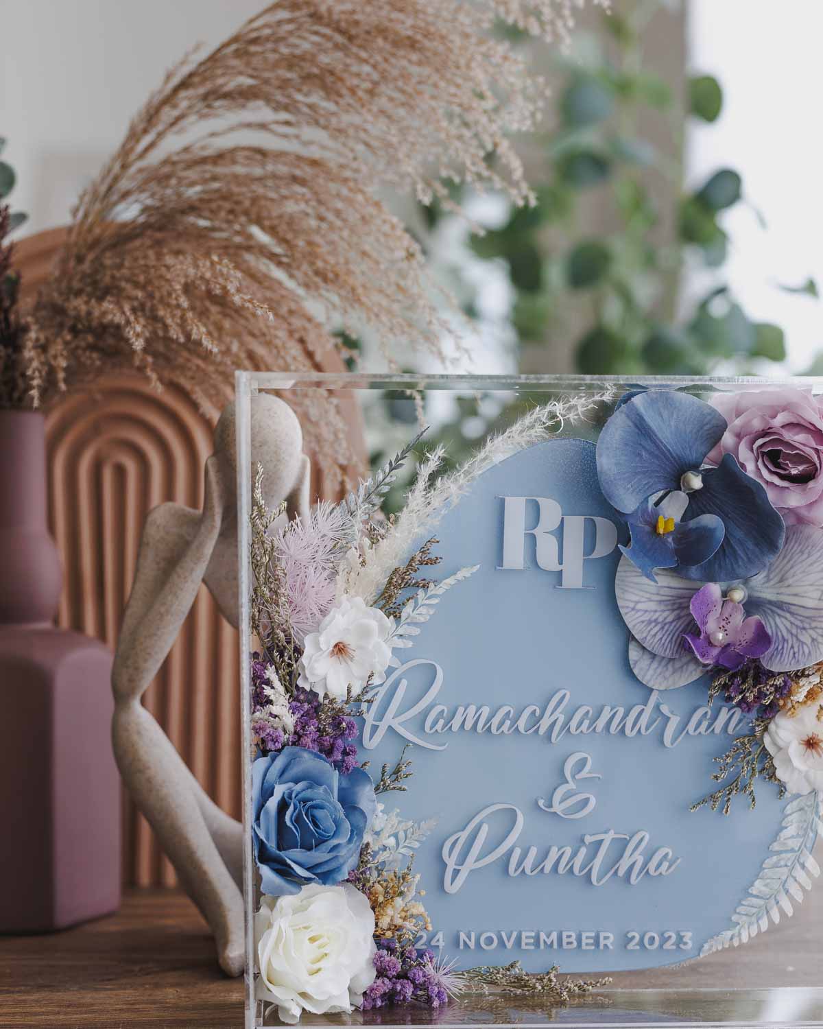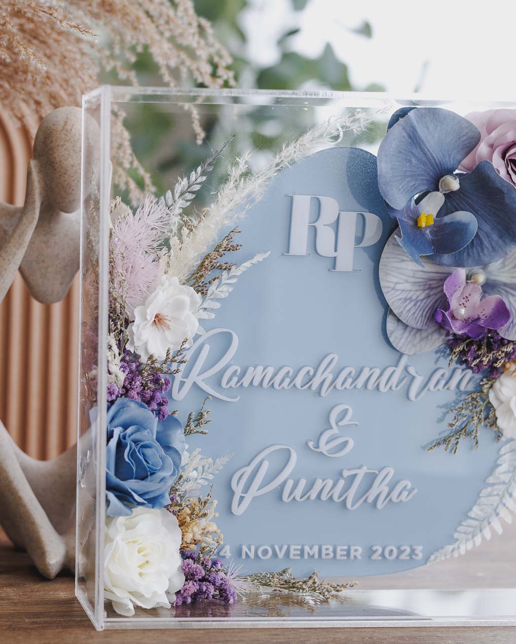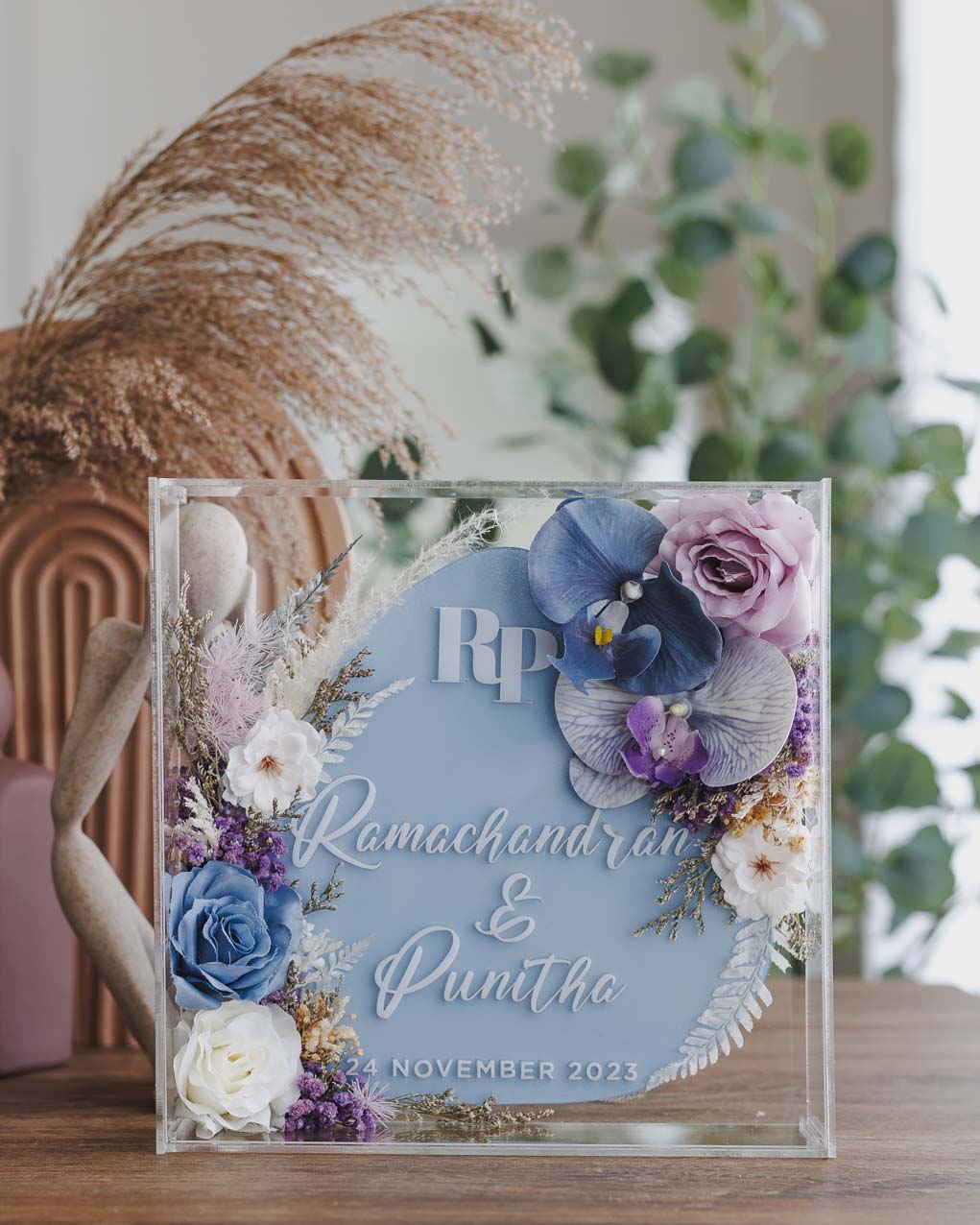 Elevate your wedding decor with our exquisite square acrylic frame, delicately adorned with vibrant red roses and shimmering gold leaves encircling the names of the happy couple. Featuring captivating red flowers and opulent golden elements atop, this stunning piece adds a touch of romance and luxury to your special day. Order now to add an unforgettable flourish to your wedding celebration!