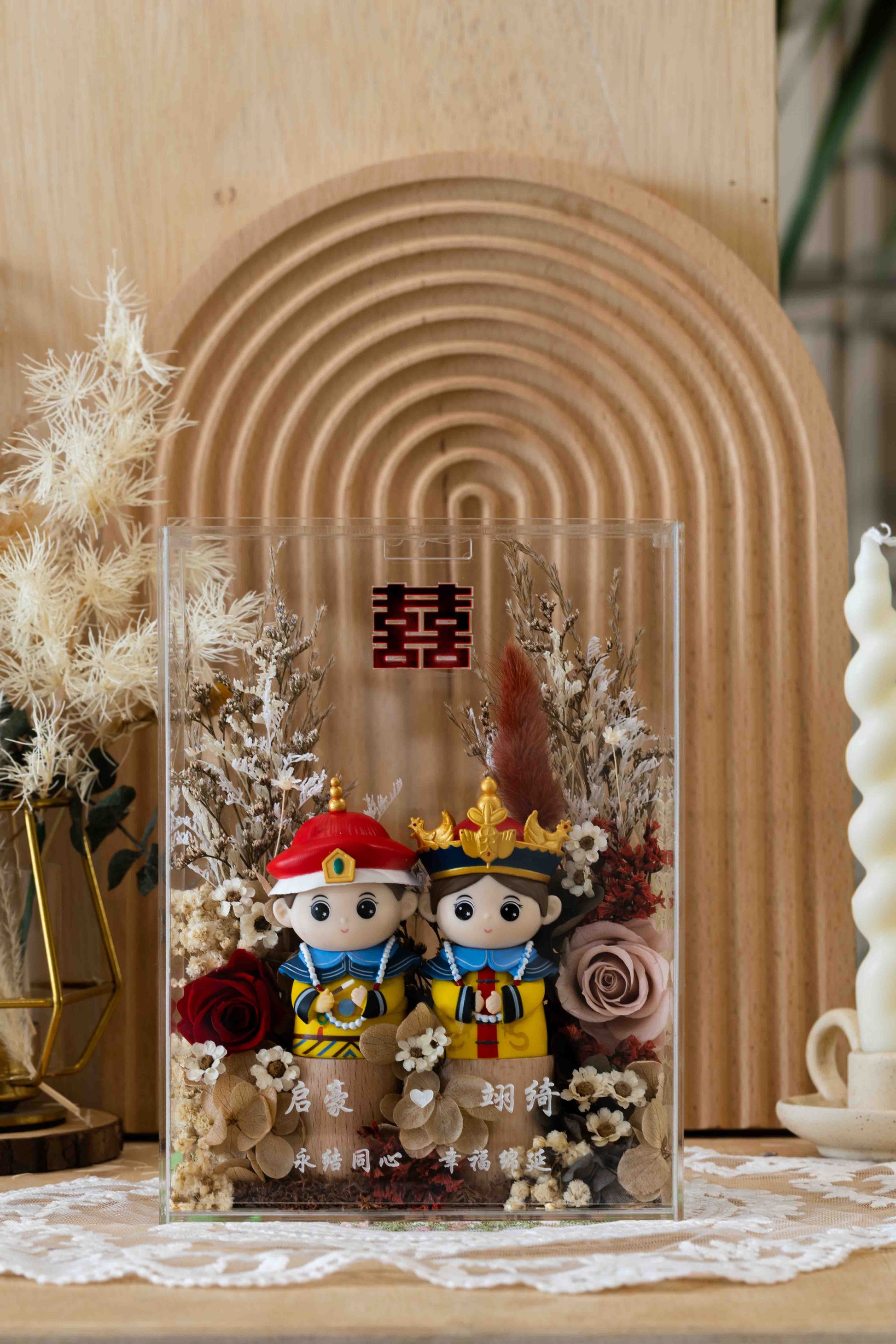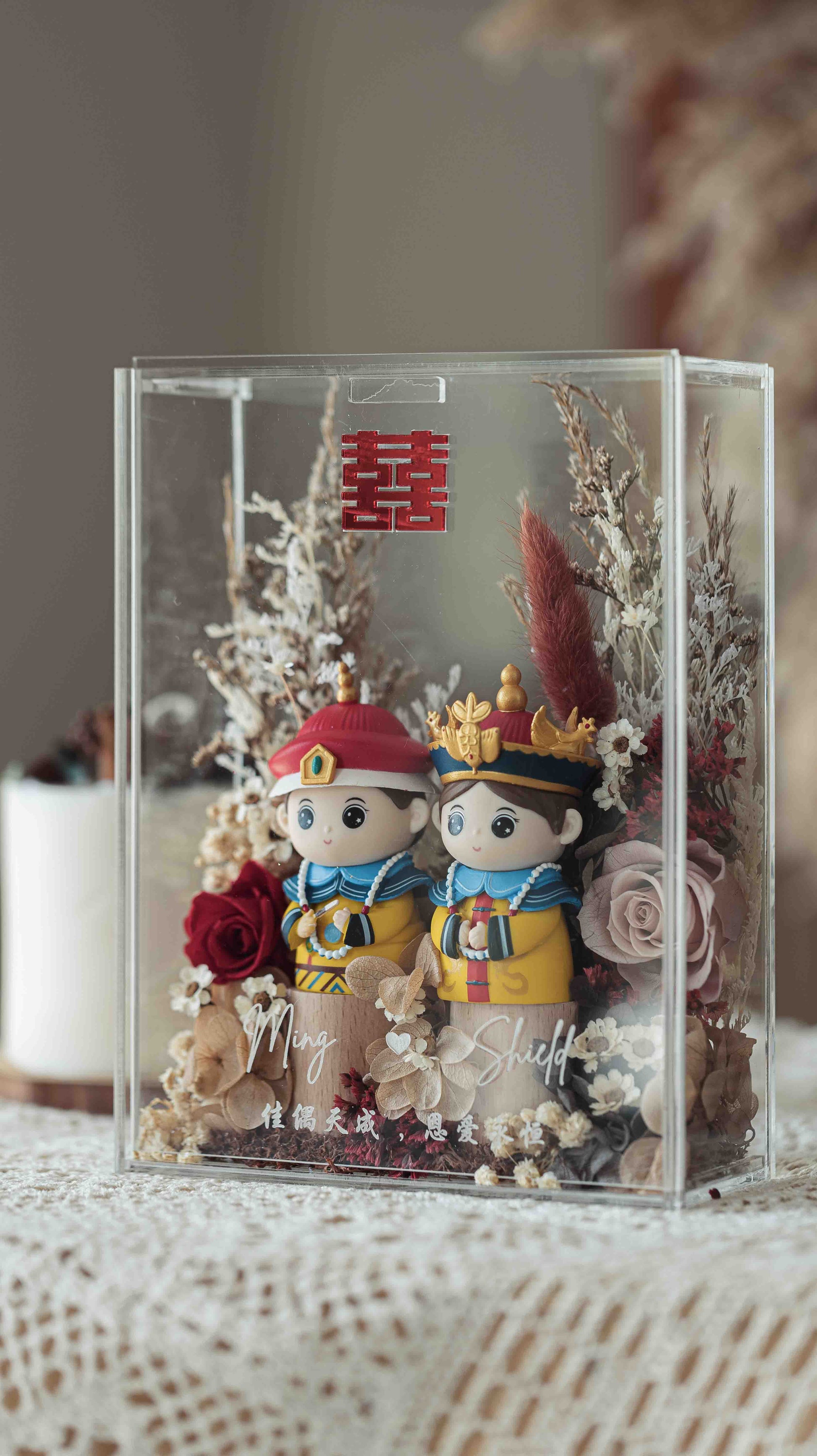 This charming wedding couple doll set is beautifully encased in an acrylic box, making it a perfect keepsake for newlyweds. The handcrafted figurines of the bride and groom are dressed in elegant attire, capturing the essence of love and celebration. Surrounding them is an exquisite floral arrangement in soft pastel tones, featuring delicate roses, hydrangeas, and dried botanicals that add a touch of natural beauty and romance. The personalized engraving at the front adds a sentimental touch, making this piece not only a wedding gift but a lasting symbol of the couple’s love story. This sophisticated display is a timeless reminder of a couple’s special day.