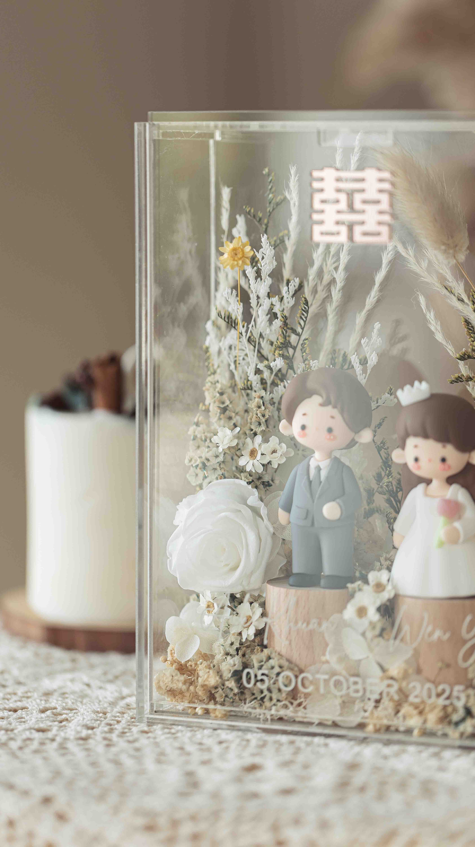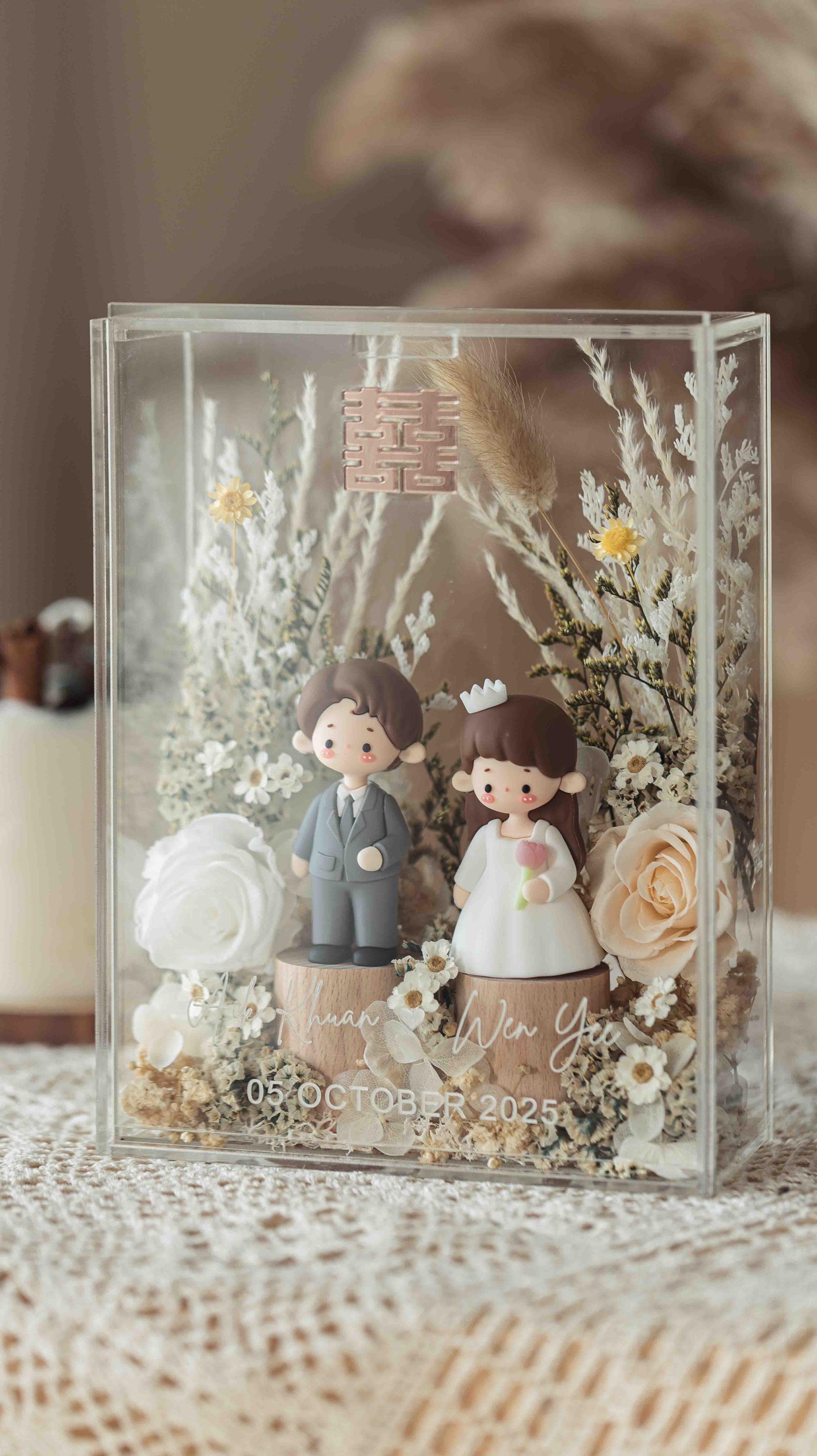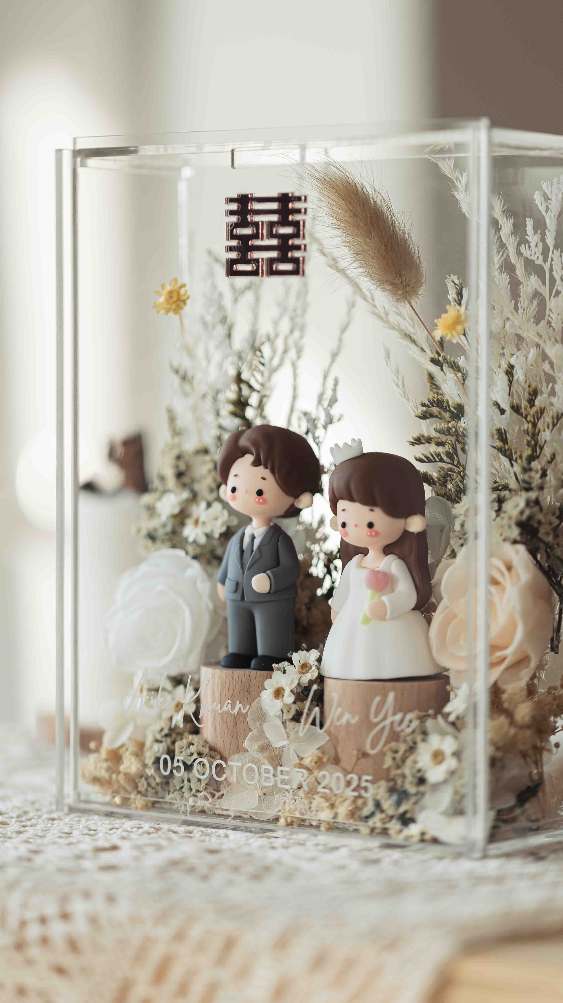 This charming wedding couple doll set is beautifully encased in an acrylic box, making it a perfect keepsake for newlyweds. The handcrafted figurines of the bride and groom are dressed in elegant attire, capturing the essence of love and celebration. Surrounding them is an exquisite floral arrangement in soft pastel tones, featuring delicate roses, hydrangeas, and dried botanicals that add a touch of natural beauty and romance. The personalized engraving at the front adds a sentimental touch, making this piece not only a wedding gift but a lasting symbol of the couple’s love story. This sophisticated display is a timeless reminder of a couple’s special day.
