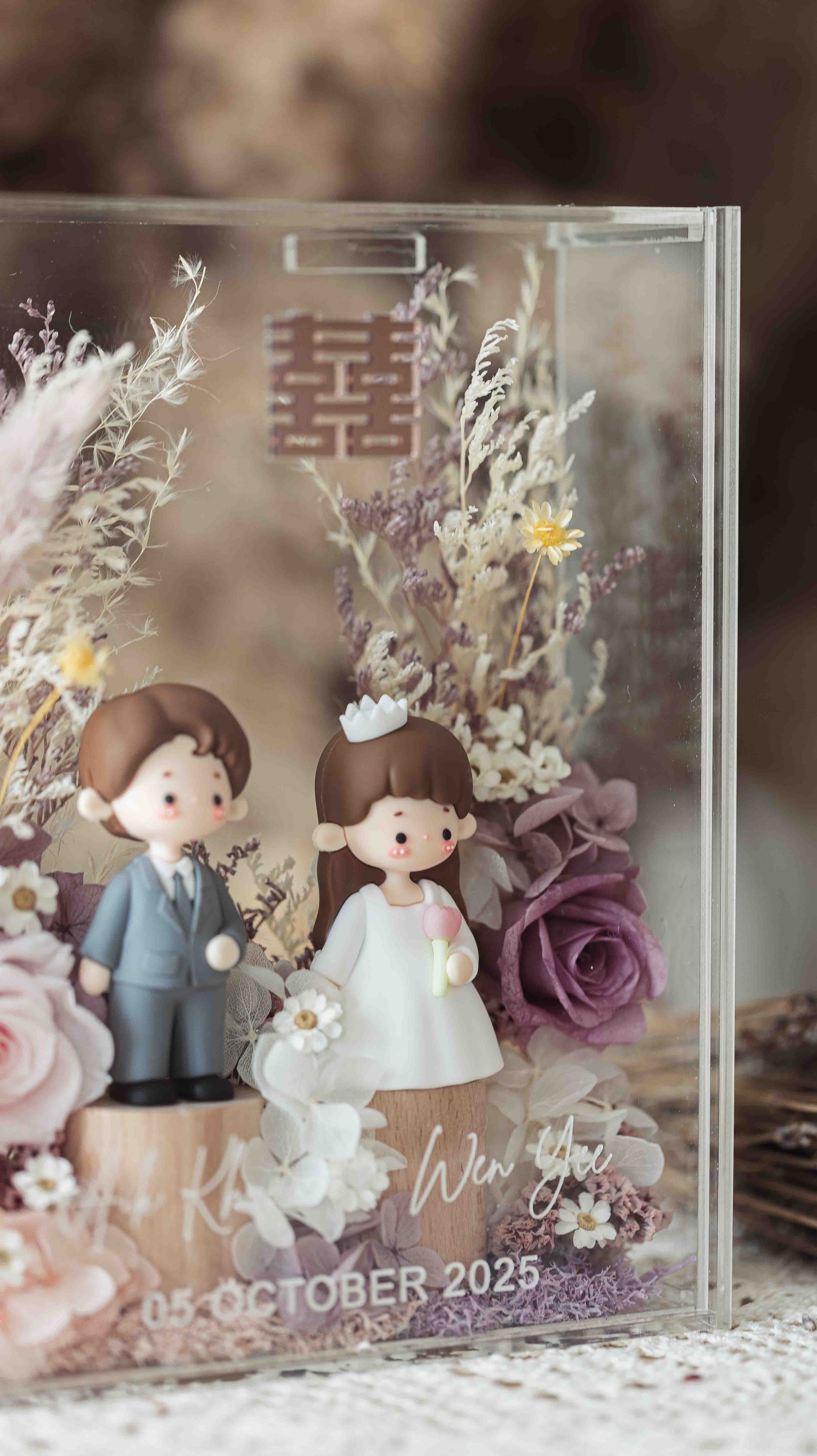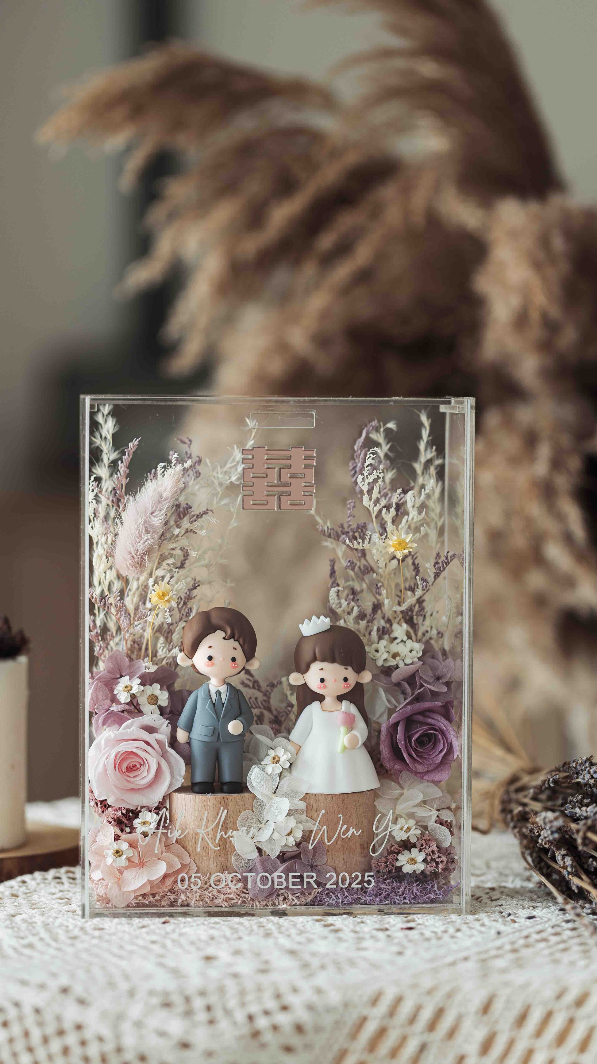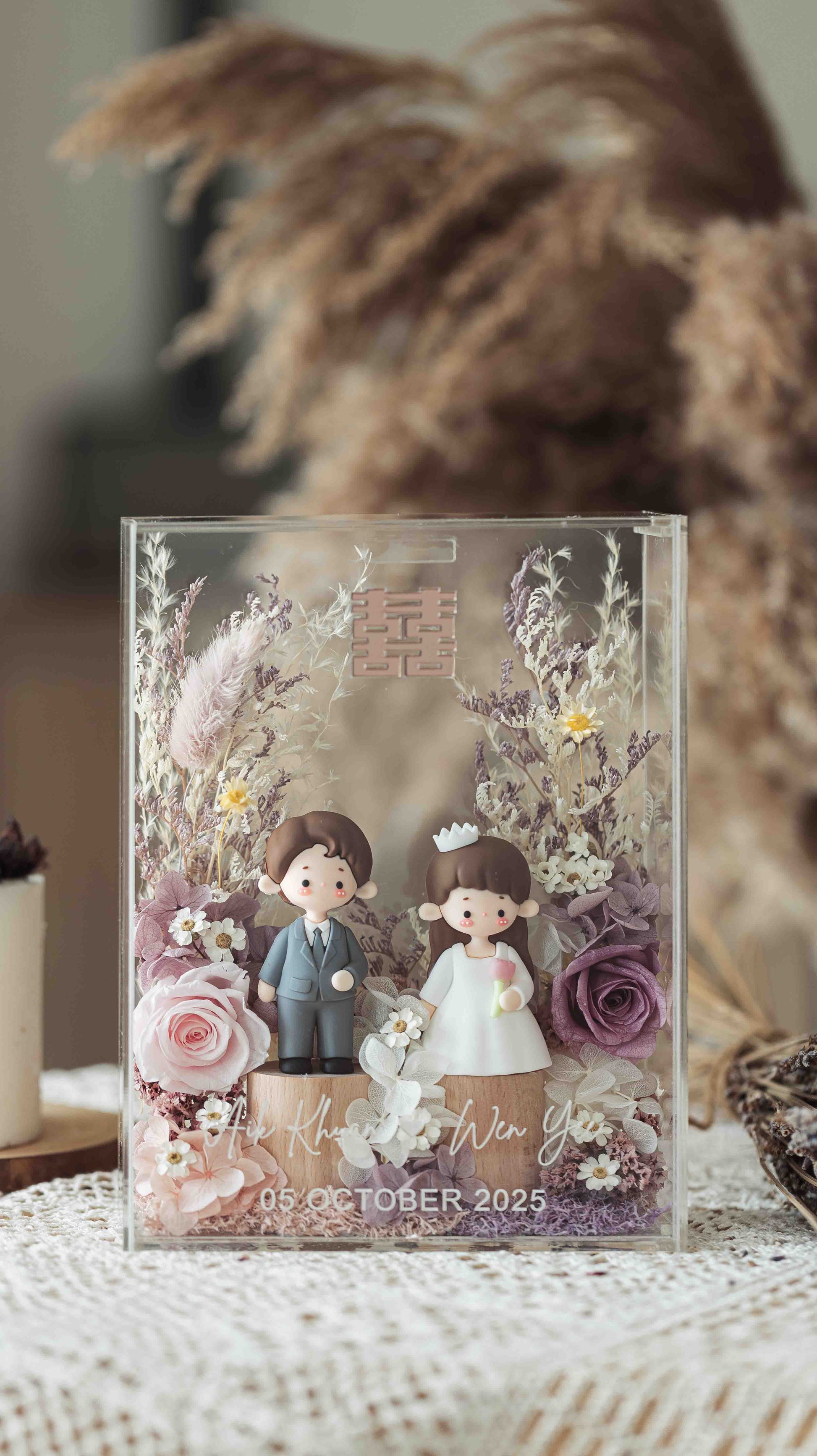 This charming wedding couple doll set is beautifully encased in an acrylic box, making it a perfect keepsake for newlyweds. The handcrafted figurines of the bride and groom are dressed in elegant attire, capturing the essence of love and celebration. Surrounding them is an exquisite floral arrangement in soft pastel tones, featuring delicate roses, hydrangeas, and dried botanicals that add a touch of natural beauty and romance. The personalized engraving at the front adds a sentimental touch, making this piece not only a wedding gift but a lasting symbol of the couple’s love story. This sophisticated display is a timeless reminder of a couple’s special day.